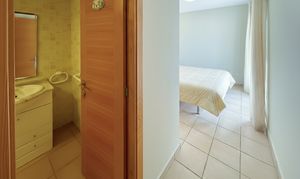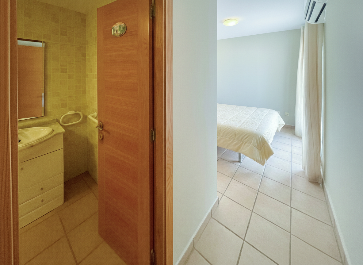 Inside, the apartment comprises two well-proportioned double bedrooms, including a main bedroom with en-suite bathroom, along with a separate shower room with guest WC. A separate kitchen provides a practical and well-defined layout suited to daily living. Both bedrooms and the kitchen also offer direct access to the terrace.