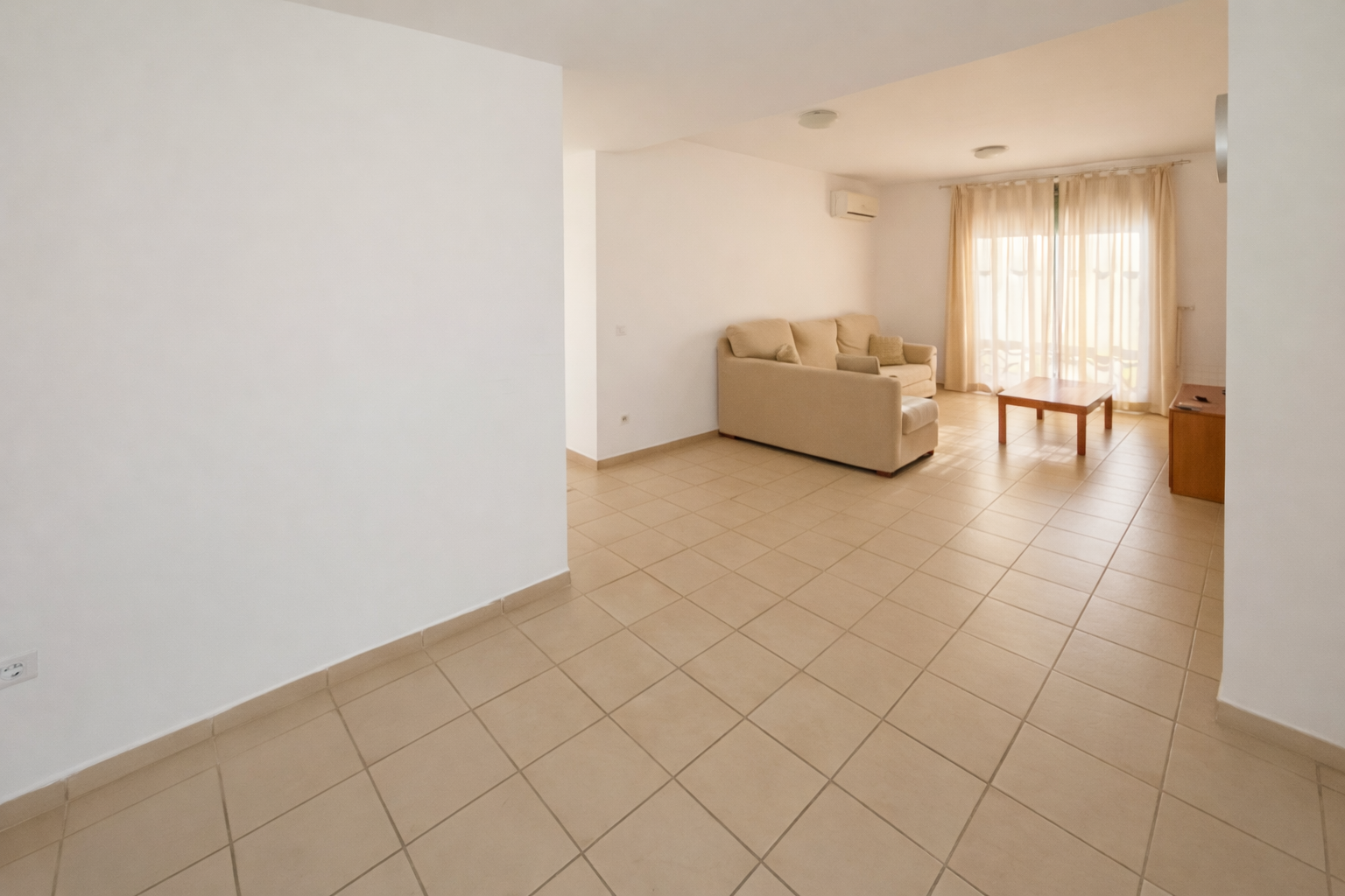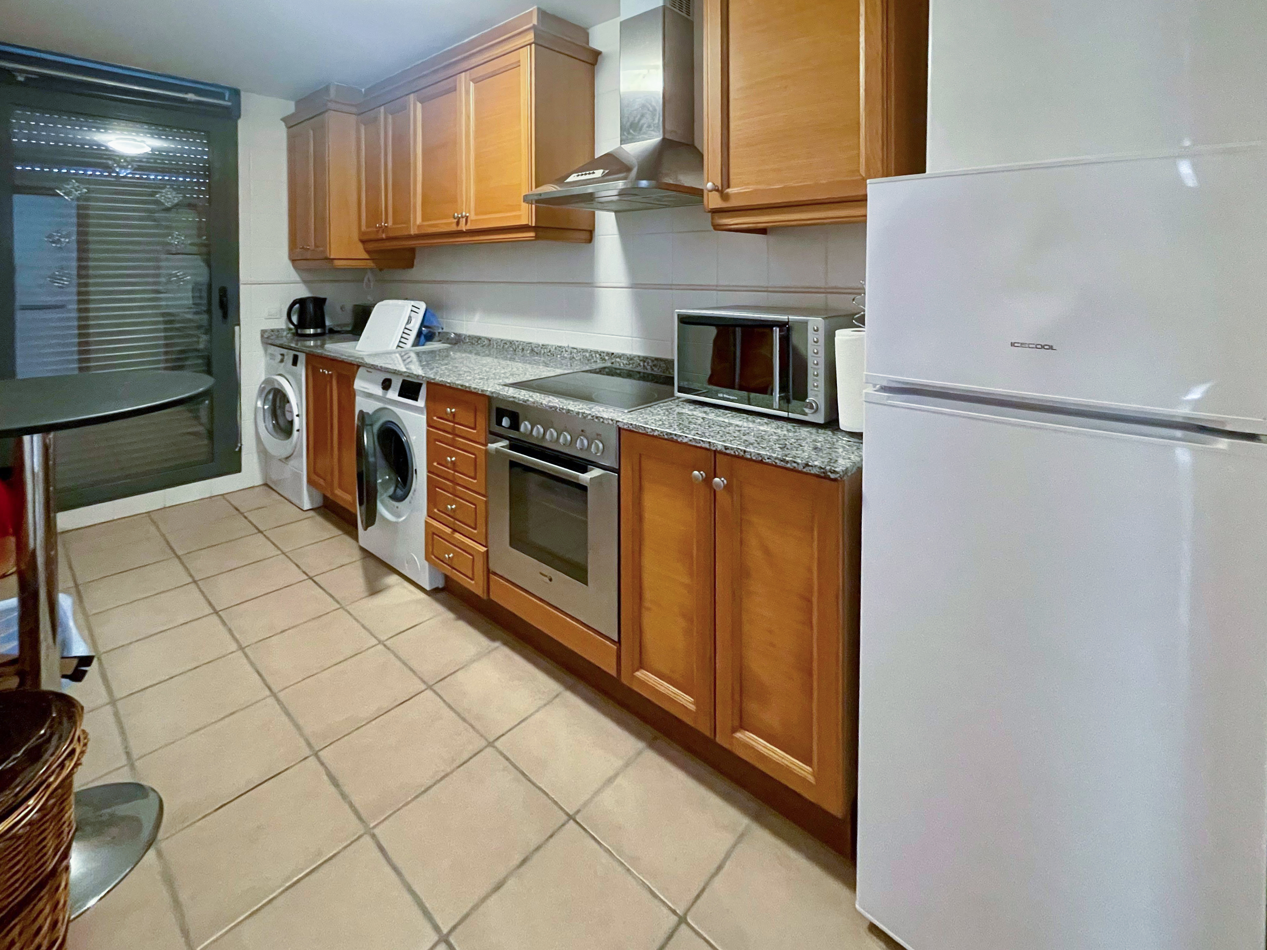 Offering direct access to a generous terrace, the lounge area offers neutral decor and tiling, air con offering cold and hot air and wi-fi and TV aerial connection. The furniture can be included with the sale at no extra expense.