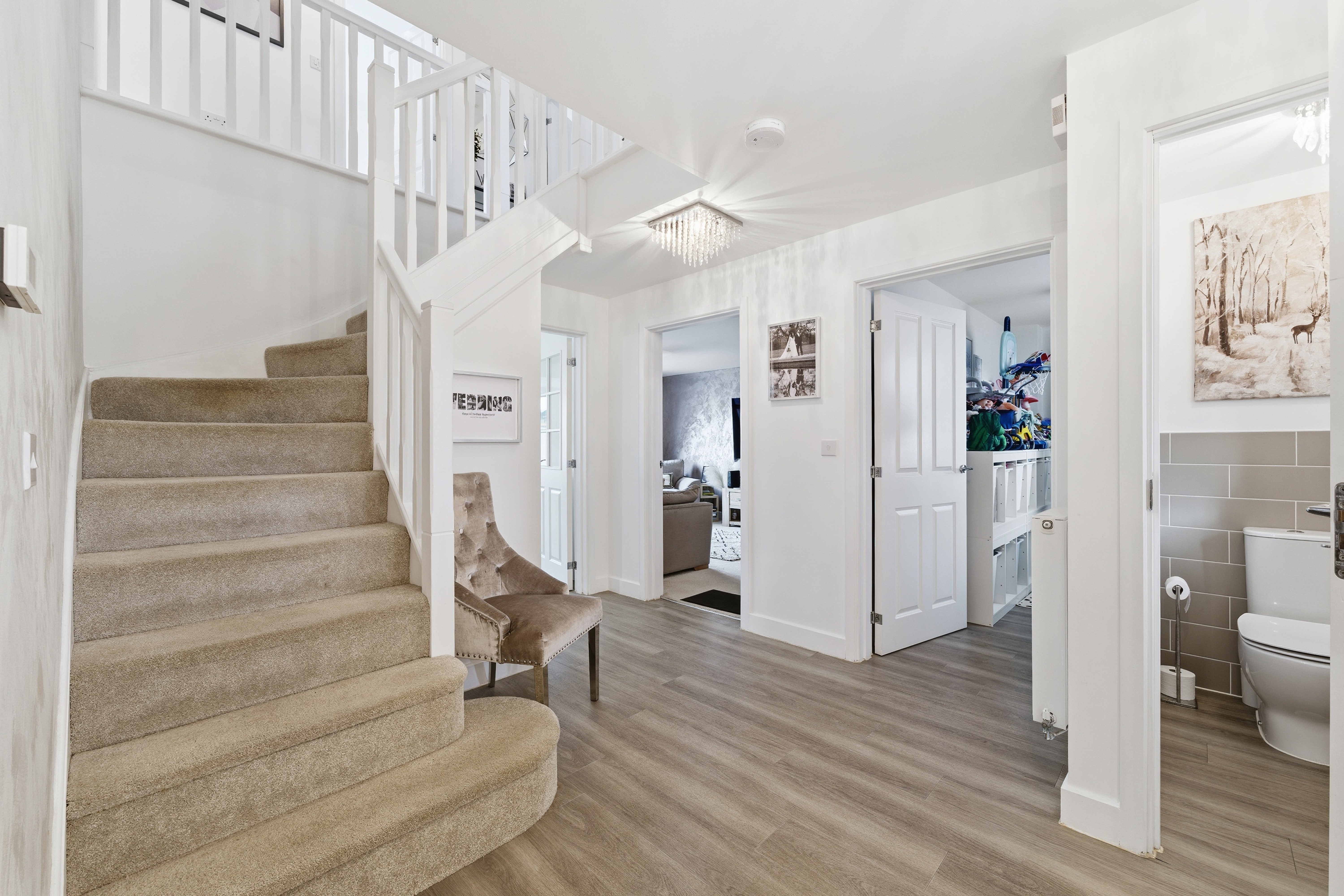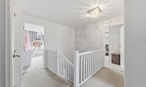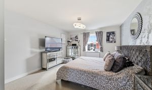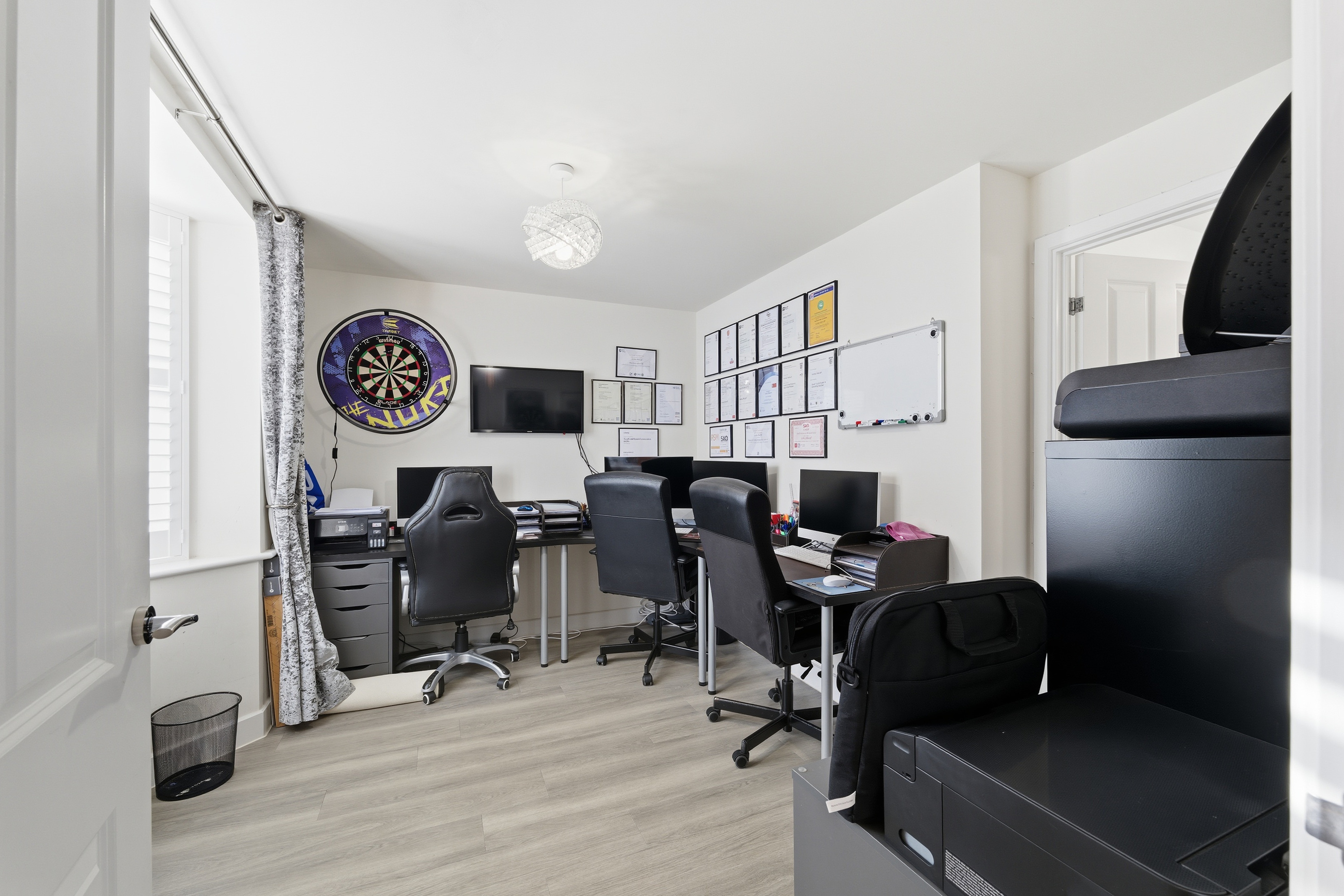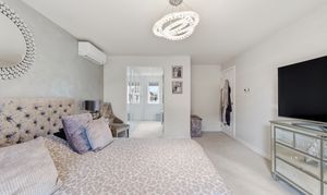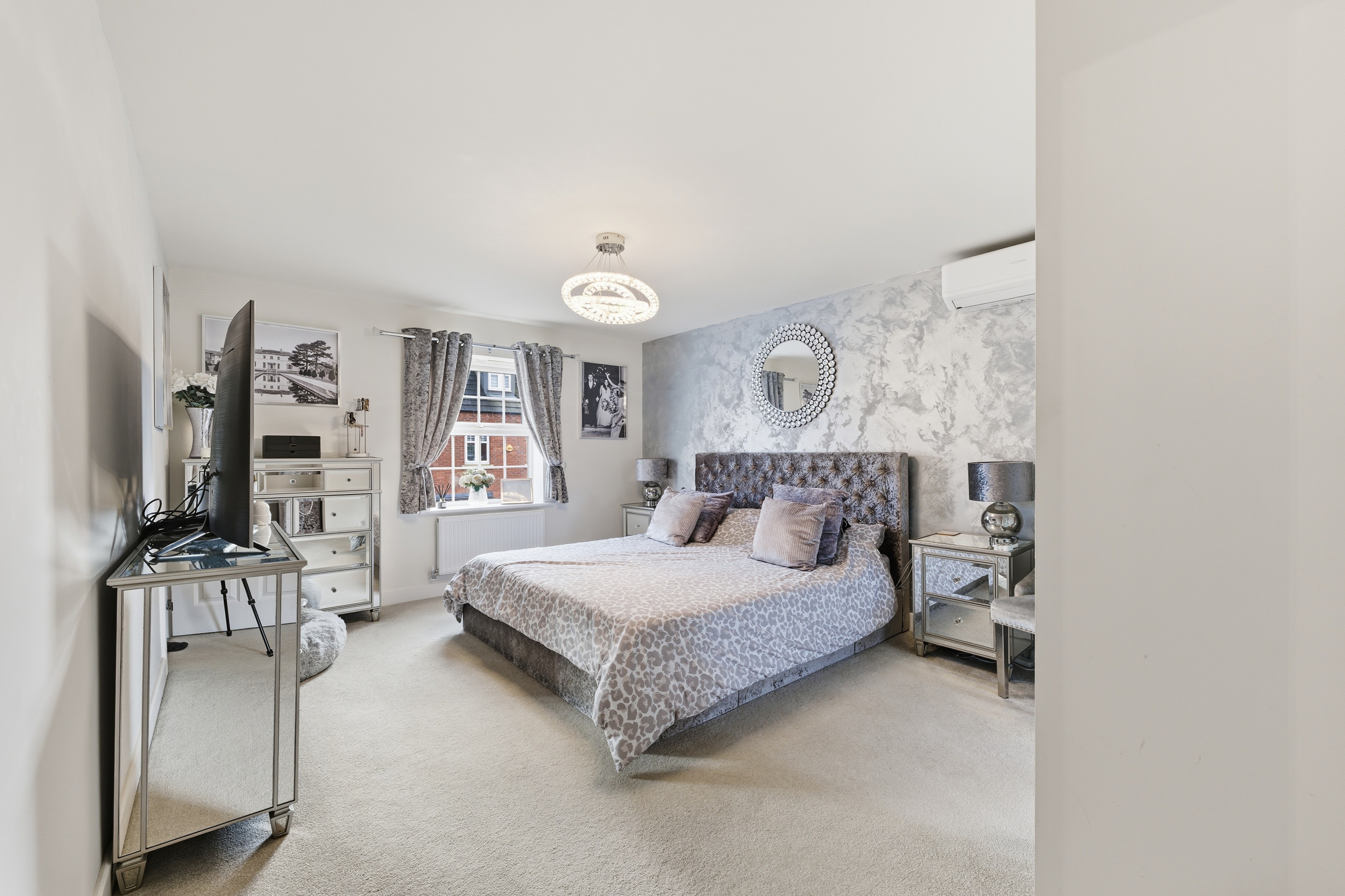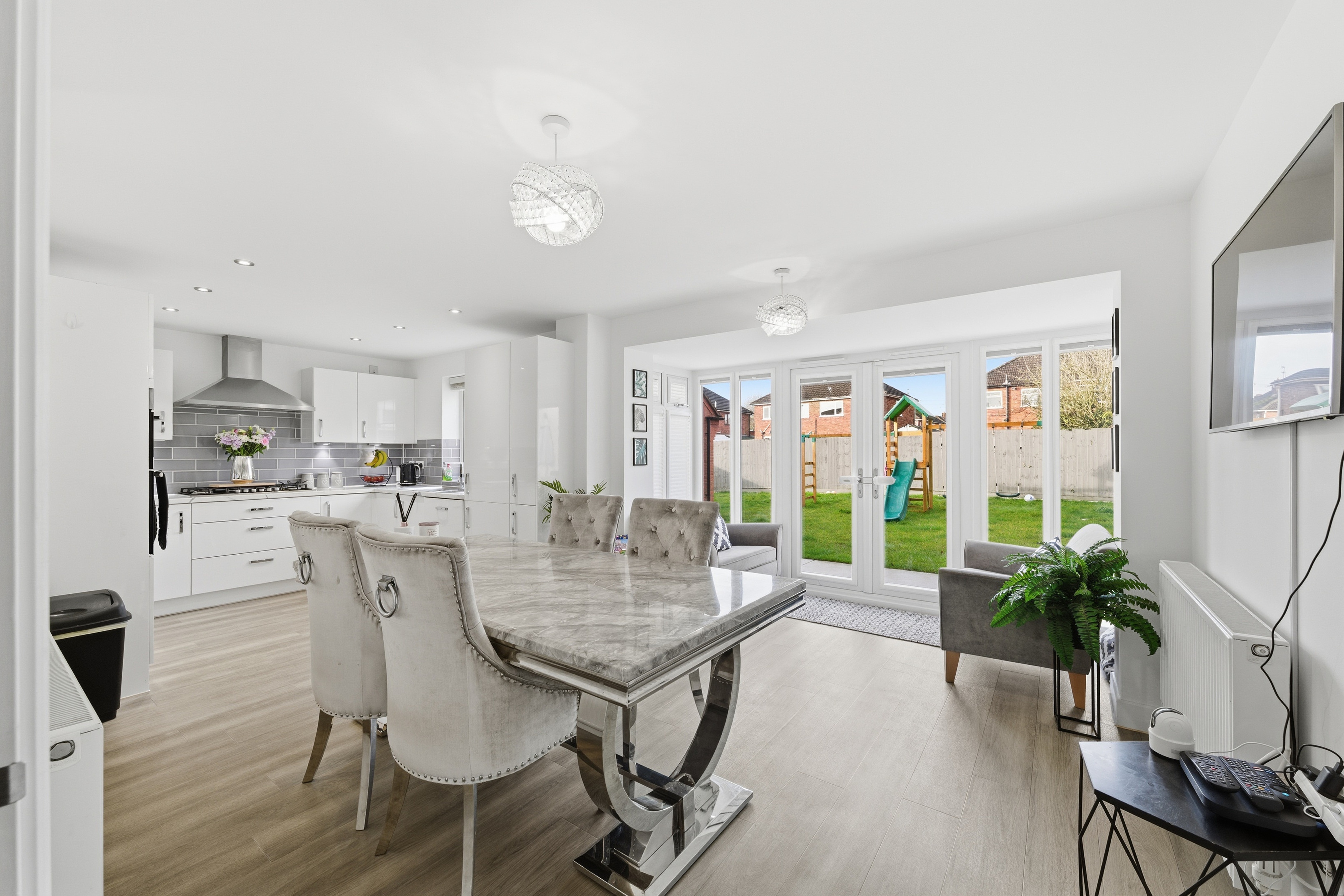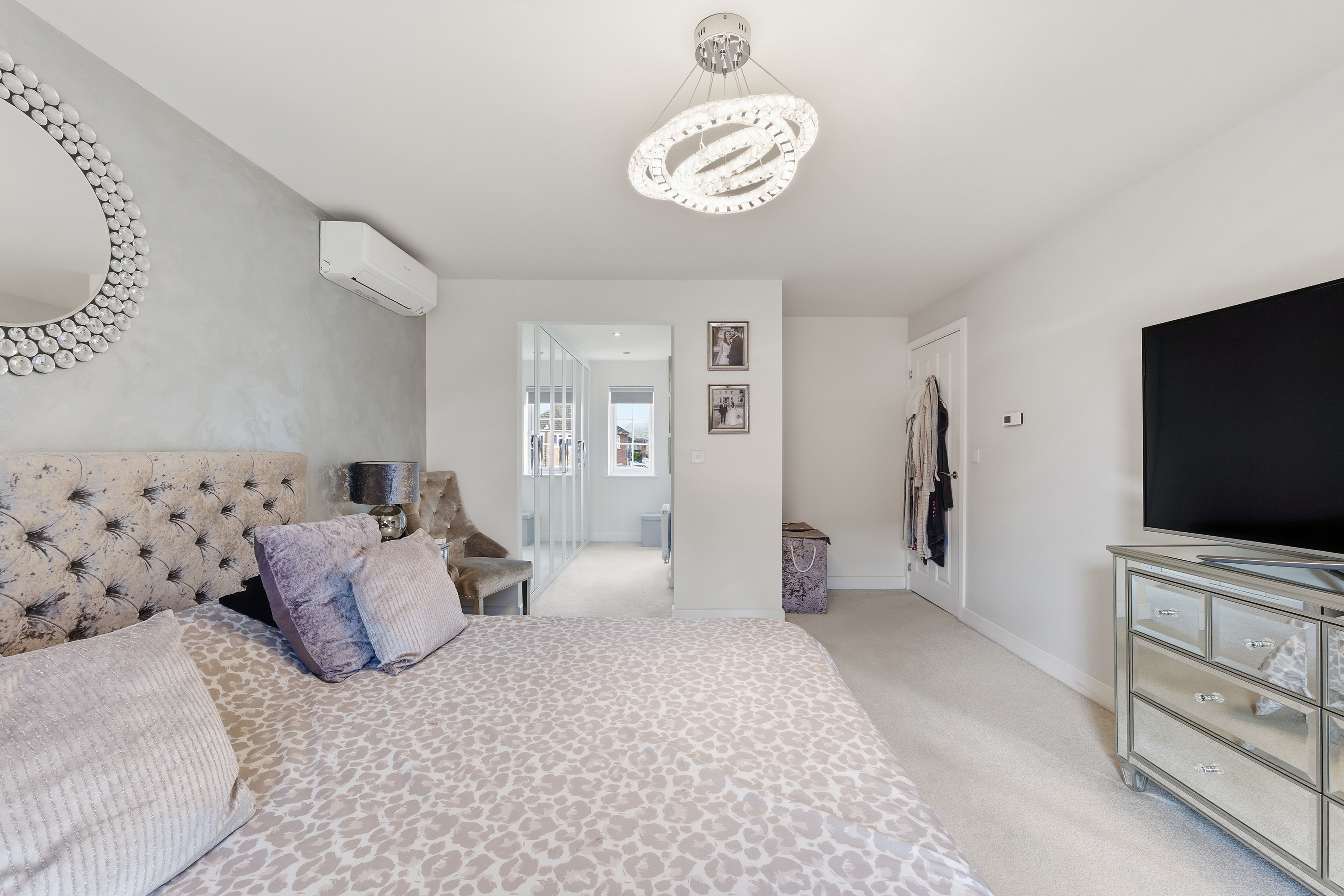 Inside, the house is finished to a high standard with an emphasis on natural light and contemporary style throughout. The heart of the home is a stunning open-plan kitchen and dining area, complete with high-gloss cabinetry, integrated appliances and stylish tiled splahbacks. Large windows and French doors flood the space with light, creating an inviting environment for family gatherings and entertaining. The living areas are generously proportioned, featuring plush carpeting, modern lighting fixtures and sophisticated decor. A dedicated home office is perfect for remote working or study. All bedrooms offer fitted wardrobes, with the master having a fantastic dressing area and air conditioning. The principal bathroom and main en-suite comprise four piece suites including a shower and bath and there is a second en-suite with shower. Additional benefits include a modern utility room with integrated appliances and convenient gated garden access.