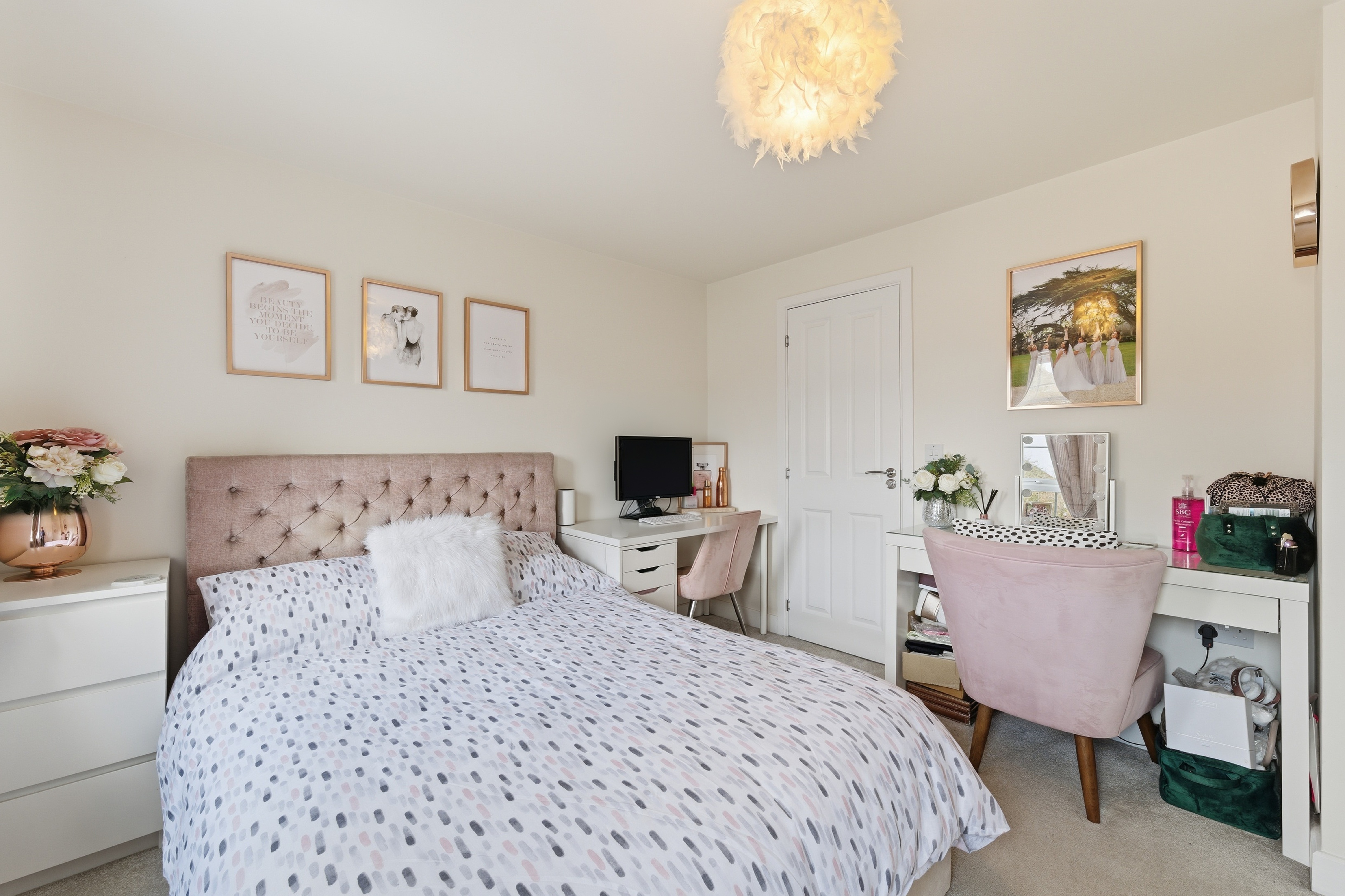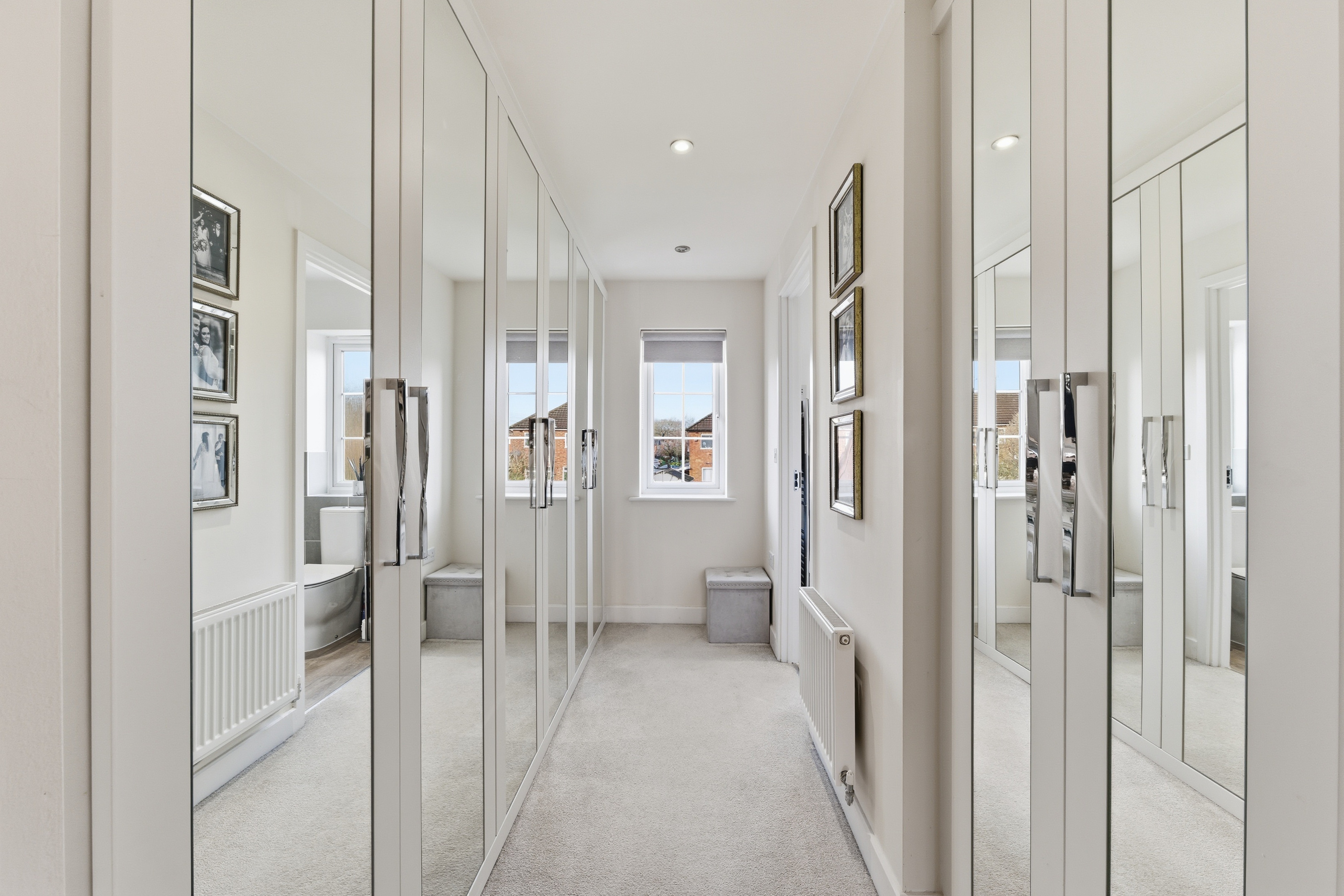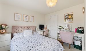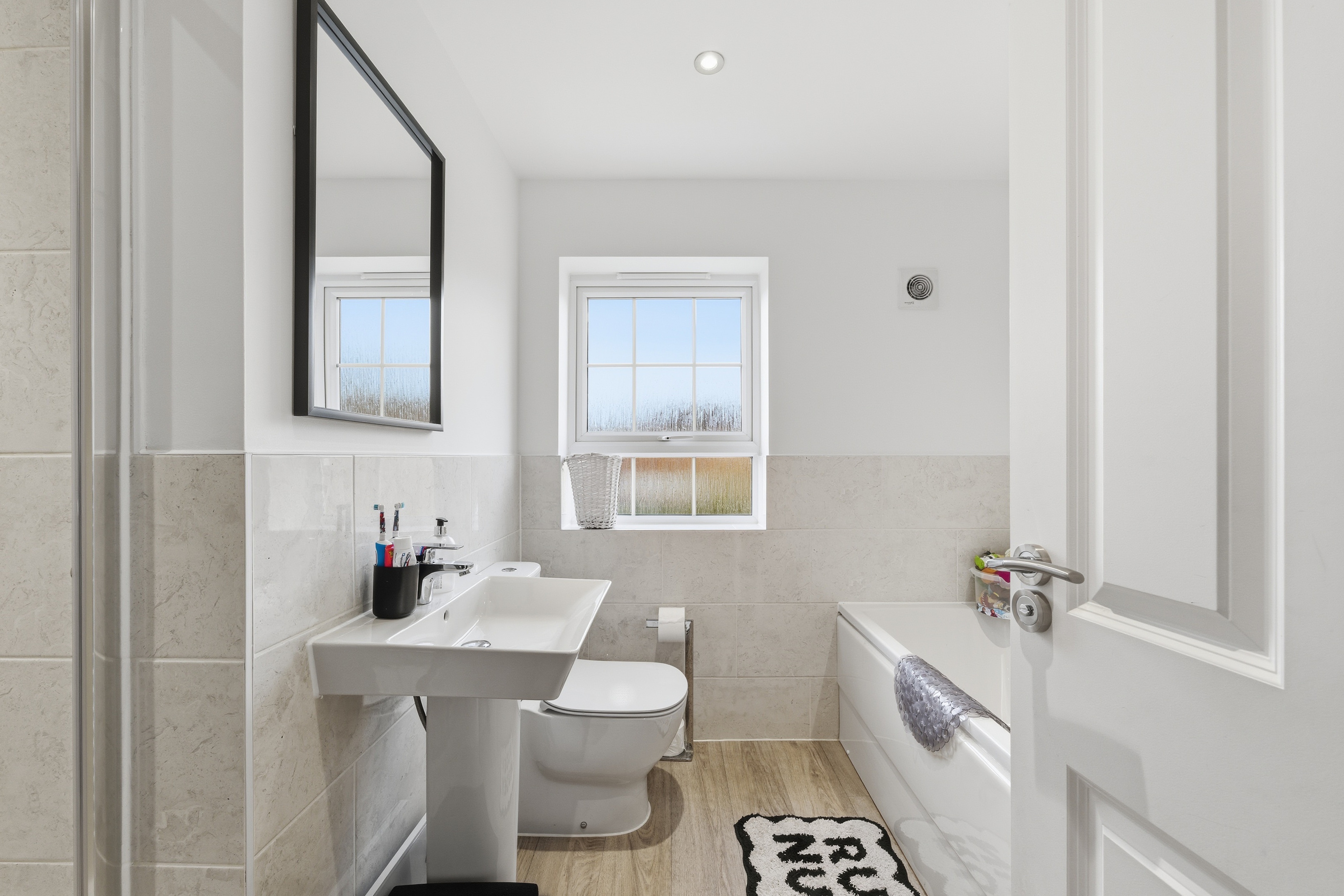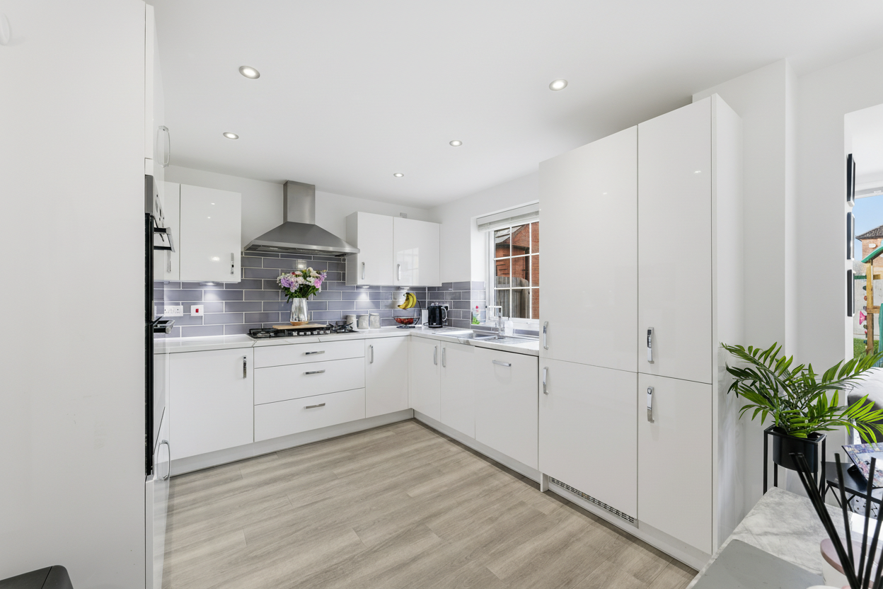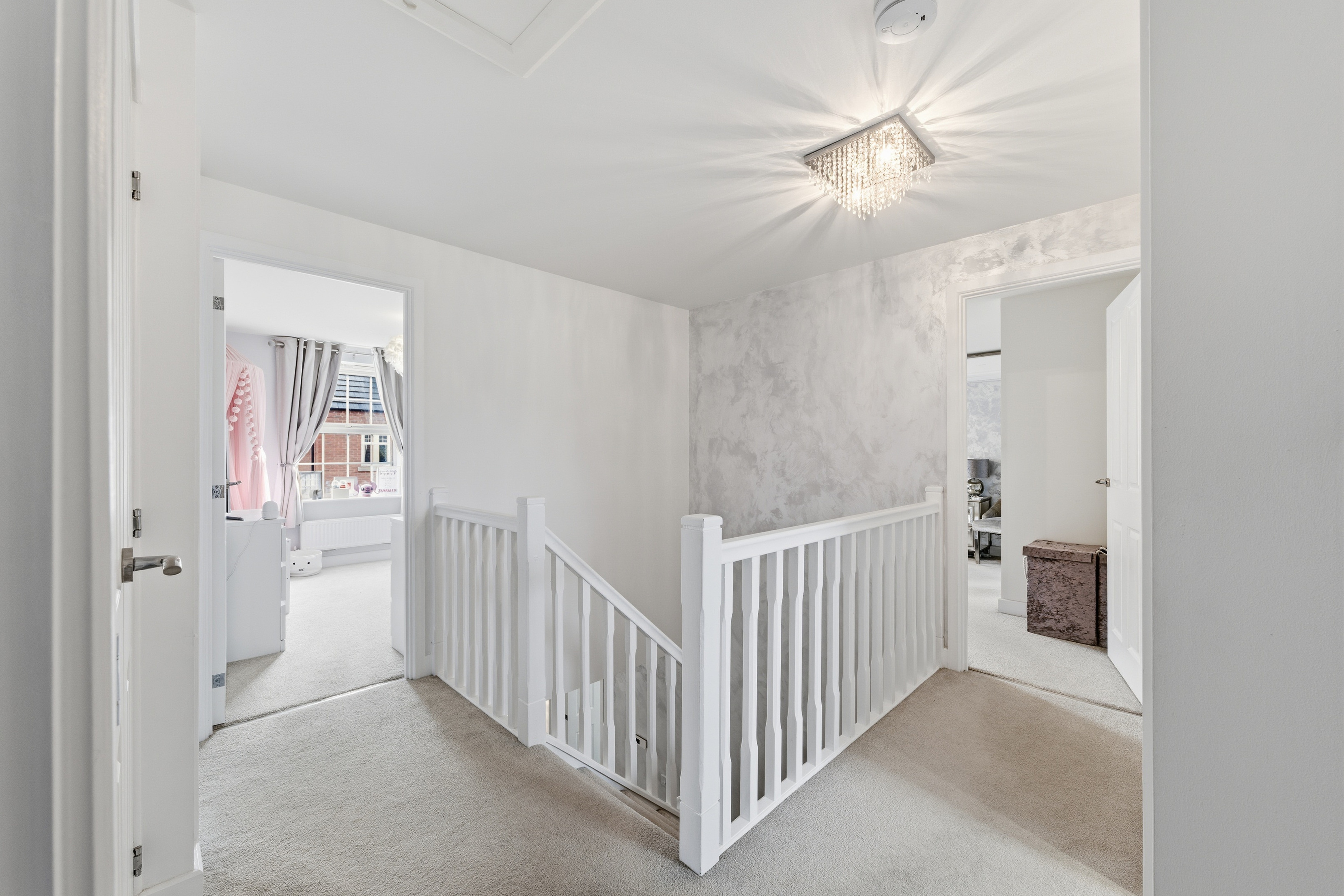 Inside, the house is finished to a high standard with an emphasis on natural light and contemporary style throughout. The heart of the home is a stunning open-plan kitchen and dining area, complete with high-gloss cabinetry, integrated appliances and stylish tiled splahbacks. Large windows and French doors flood the space with light, creating an inviting environment for family gatherings and entertaining. The living areas are generously proportioned, featuring plush carpeting, modern lighting fixtures and sophisticated decor. A dedicated home office is perfect for remote working or study. All bedrooms offer fitted wardrobes, with the master having a fantastic dressing area and air conditioning. The principal bathroom and main en-suite comprise four piece suites including a shower and bath and there is a second en-suite with shower. Additional benefits include a modern utility room with integrated appliances and convenient gated garden access.