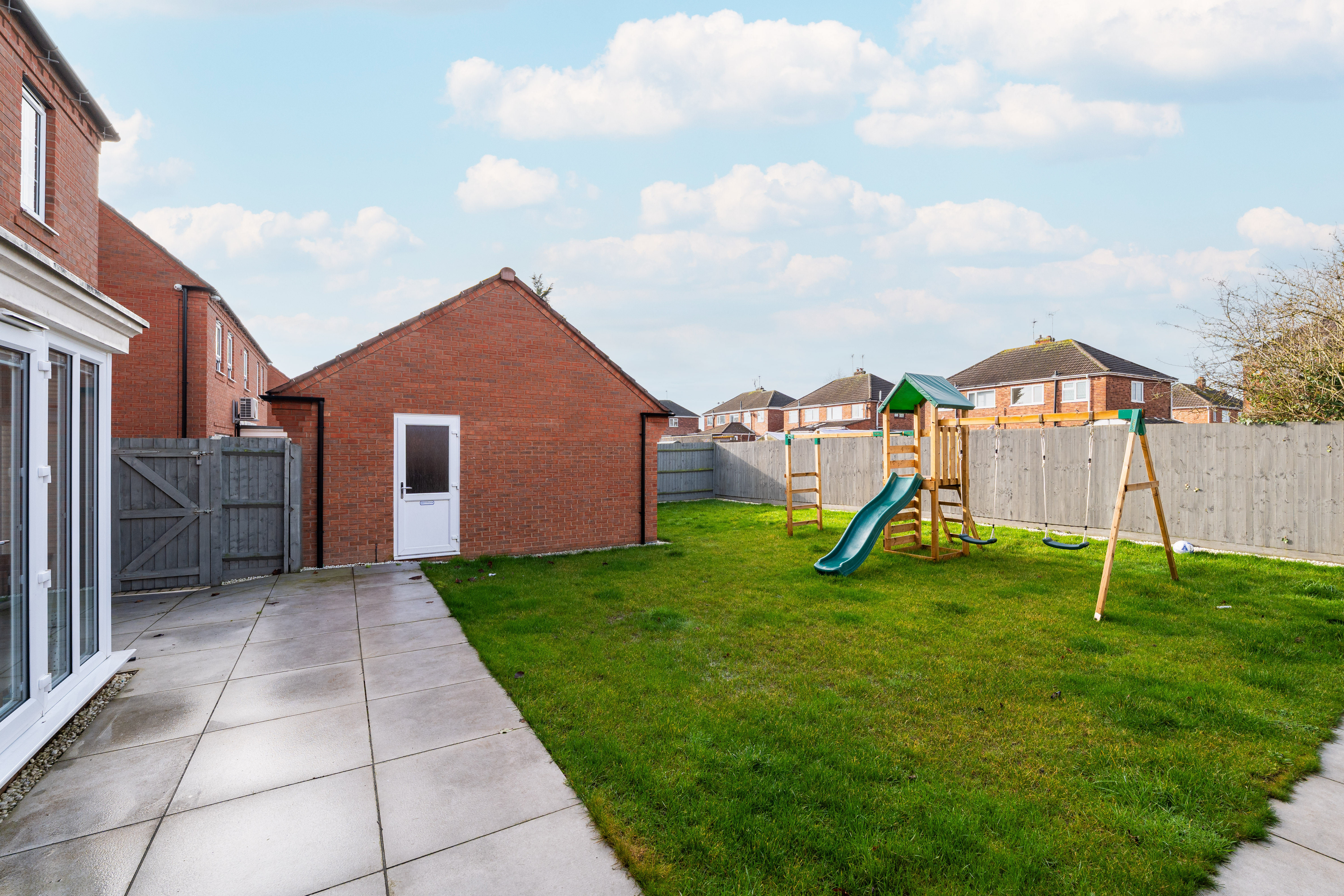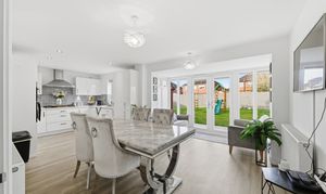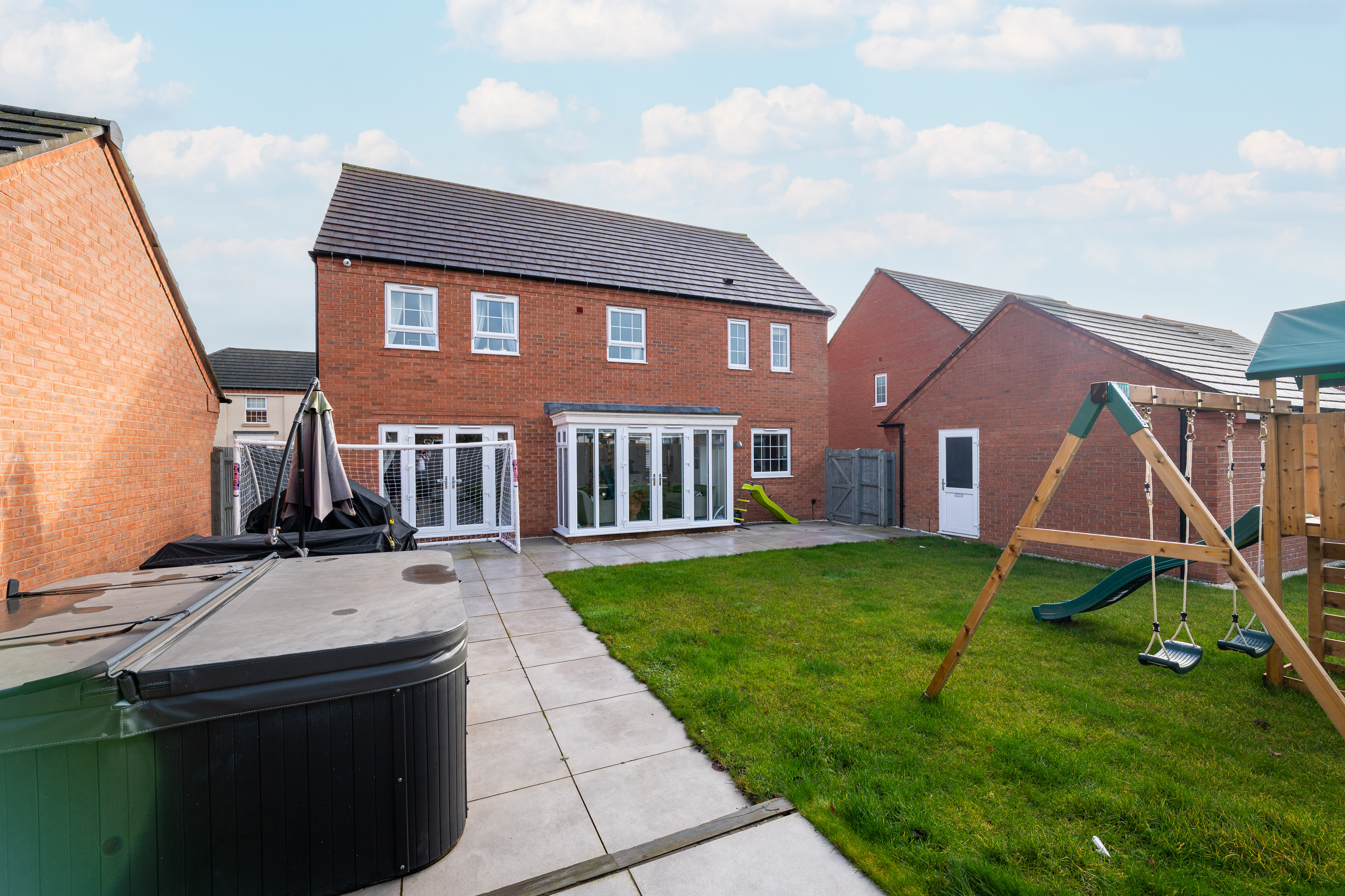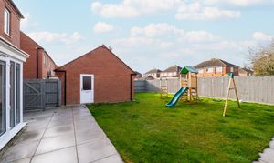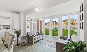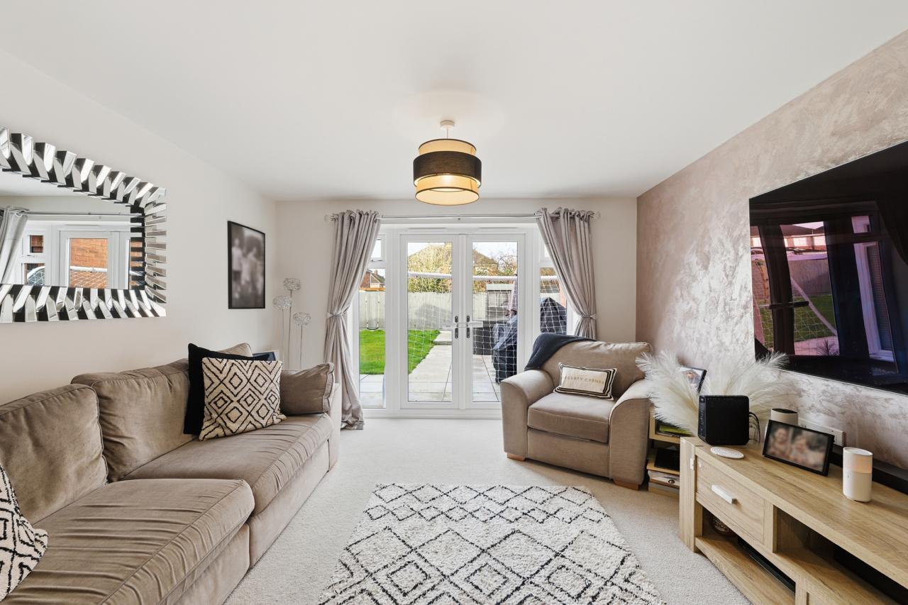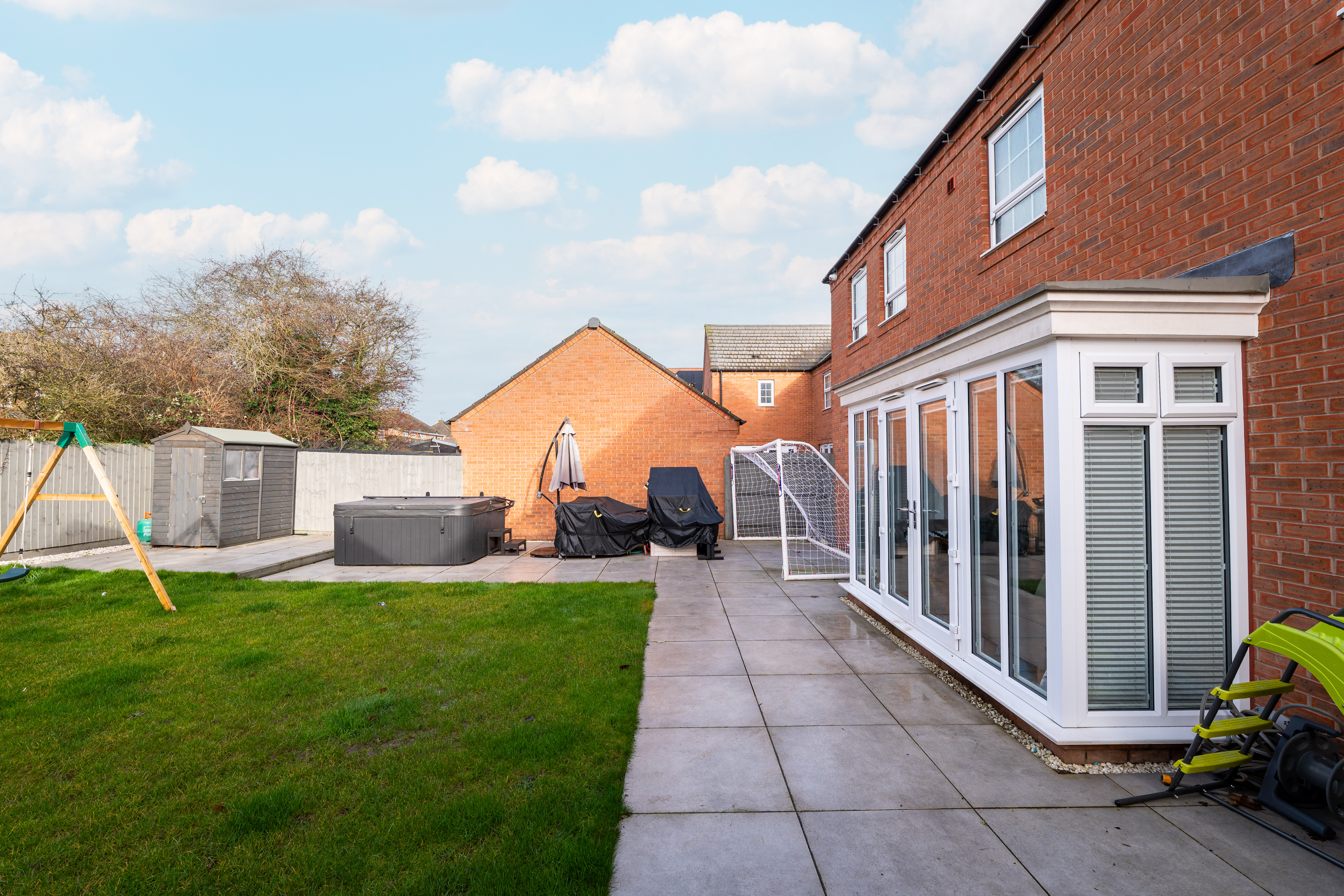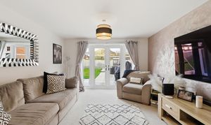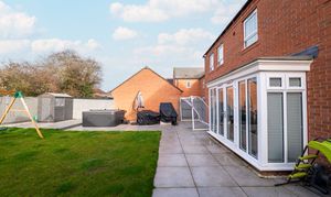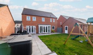 This exceptional four double bedroom, three-bathroom detached house offers an outstanding blend of contemporary design, versatile living spaces, and impressive outdoor amenities. Constructed by David Wilson Homes to the extremely popular ‘Winston’ design and boasting three generous reception rooms, this home is ideally suited for families seeking space, comfort, and modern convenience. The property’s attractive brick facade, large windows, and neatly landscaped front garden with manicured hedges create strong kerb appeal, while off-road parking and a detached double garage provide ample space for vehicles and storage. The spacious, well-maintained rear garden is a true highlight, featuring a lawn, paved patio and additional outdoor shed - perfect for entertaining, relaxation, and family activities. French doors from the main living areas offer seamless access to the garden, enhancing the sense of indoor-outdoor living.