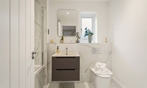 Contemporary bathrooms with rain showers, vanity units, mirrors & chrome towel rails