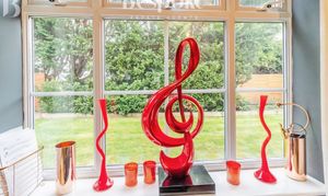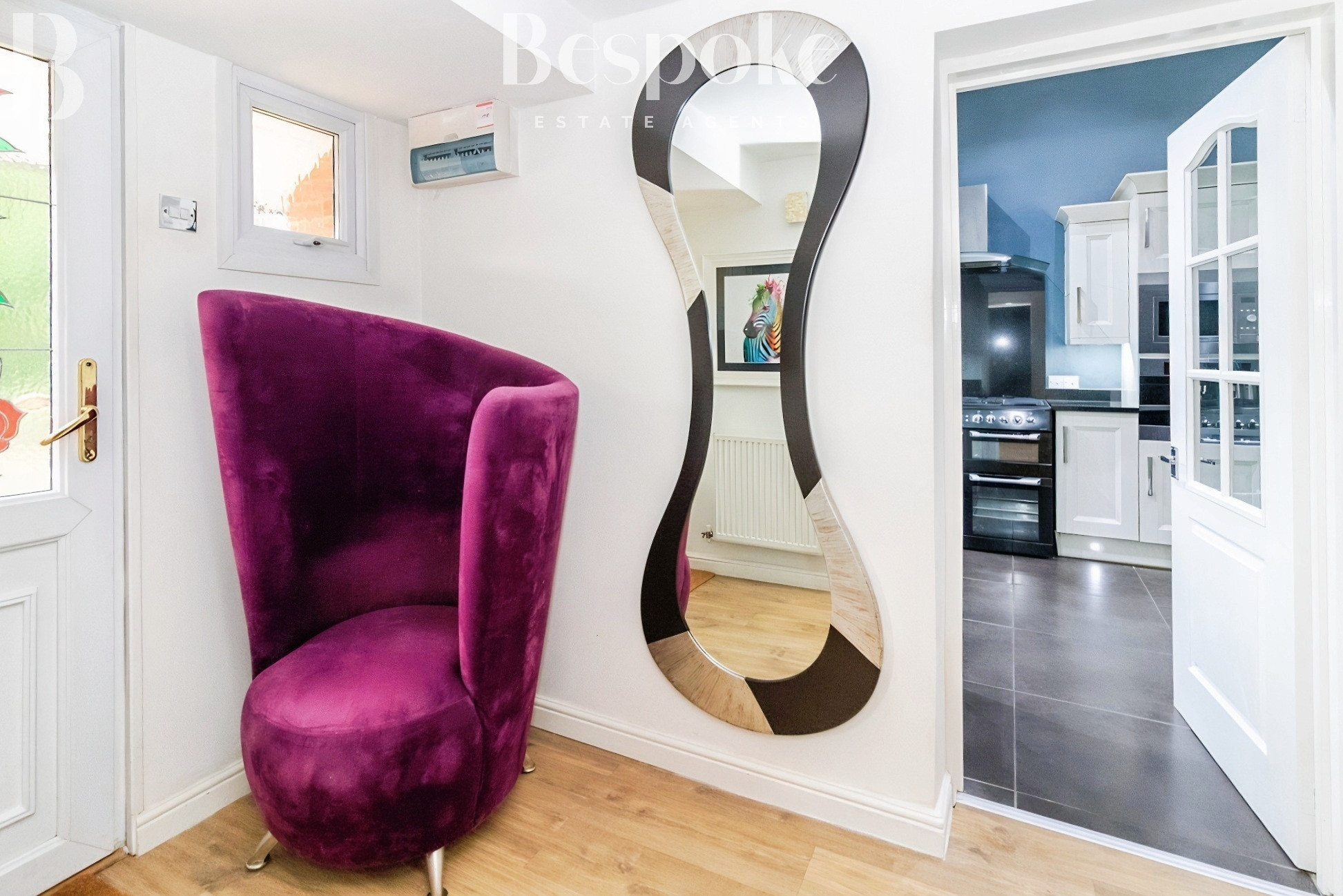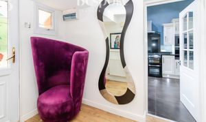 A bright and welcoming entrance hall that sets the tone for the rest of the home. The space enjoys natural light from the feature stained glass front door and small side window, creating a warm first impression. There is plenty of room for coats and shoes, along with space for statement furniture, as shown by the current layout. Smooth wood-effect flooring runs through the hall and into the main living areas, giving the ground floor a seamless and modern feel.