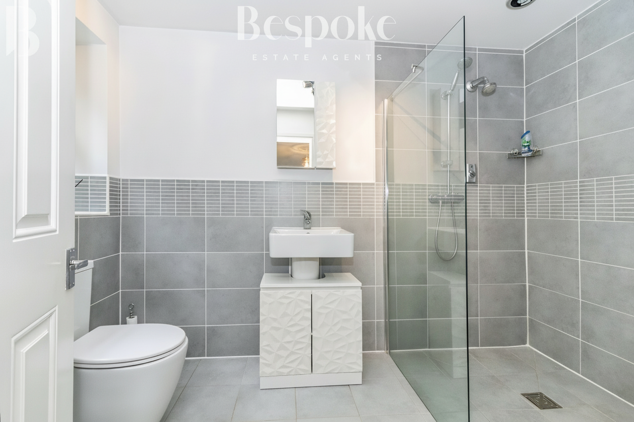 Finished in contemporary grey and white tones, the ground floor shower room features a large walk-in shower with glass screen, a stylish vanity unit beneath the basin, and a modern WC. A window to the rear brings in natural light, while a heated towel rail adds warmth and convenience. Sleek tiling and clean lines give the room a fresh and modern feel.