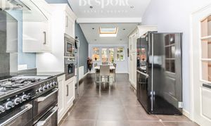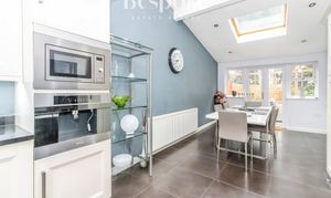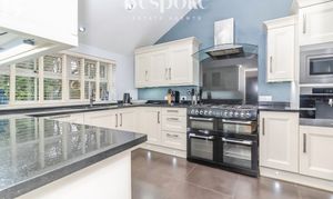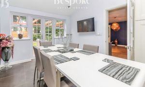 The kitchen dining room is a standout feature of the home, designed with light, space, and everyday living in mind. A vaulted ceiling with inset skylights creates an impressive sense of height, while the layout flows beautifully from the sleek fitted kitchen through to a bright dining area overlooking the garden. The kitchen itself is finished to a high standard with granite worktops, integrated appliances, under-cabinet lighting, and a large range cooker that makes the space ideal for keen cooks. A wide window to the front brings in the morning sun, while French doors at the rear open directly onto the patio, perfect for relaxed dining or entertaining outdoors. The dining space easily accommodates a large table and enjoys views of the garden, making it a welcoming spot for everyday meals or hosting family and friends. The combination of vaulted ceilings, generous proportions, and natural light gives this room a real sense of magic.