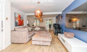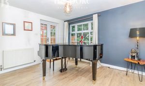 The main living room stretches the full depth of the property, creating a generous and versatile space for everyday family life and relaxed entertaining. Large bay window to the front and French doors to the rear, fill the room with natural light, complemented by soft neutral décor and wood-effect flooring for a warm, modern feel. Double doors open through to the study, offering the option of an extended open-plan layout when needed, while a second set of French doors leads directly out to the garden and patio. There is also a single door connecting neatly to the kitchen for easy flow between the main living areas. A built-in understairs cupboard provides useful hidden storage, keeping the room uncluttered and practical. The size and shape of this living space make it ideal for flexible furniture placement, whether for family movie nights, larger gatherings, or a quiet evening to unwind.
