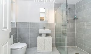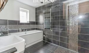 The en-suite is a generous, modern space finished in contemporary grey tiling with mosaic detailing. It features a full-size fitted bath and a large walk-in rainfall shower, giving you the choice of a quick refresh or a long soak. There is a sleek vanity unit with inset basin, a concealed cistern WC and a heated towel rail for added comfort. A window to the side brings in natural light and ventilation, keeping the room bright and fresh. A beautifully designed space that feels more like a luxury hotel suite than a typical en-suite.