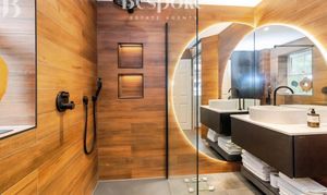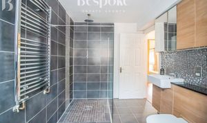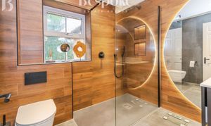 Finished to an exceptional standard, the luxury family shower room has been fully remodelled to create a boutique, hotel-style space. A large walk-in rainfall shower sits behind a frameless glass screen, complemented by sleek matt-black fixtures and built-in illuminated wall niches for a clean, contemporary look. The full-height wood-effect tiling adds warmth and texture, contrasted beautifully with the large backlit feature mirror that floods the room with soft ambient lighting. There is a wall-hung vanity unit with countertop basin, excellent storage, and a wall-hung WC for a modern, streamlined finish. A window brings in natural light while maintaining privacy. A genuinely impressive room that feels more like a luxury spa suite than a typical family shower room.