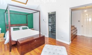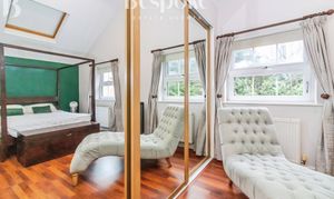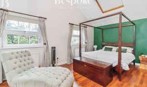 The principle bedroom is a generous and beautifully designed main bedroom with a vaulted ceiling that adds height and a real sense of openness. A Velux window above brings in natural light throughout the day, complemented by twin picture windows overlooking the rear garden and green space, for a peaceful outlook. The room is fitted with wall to wall, floor to ceiling wardrobes offering excellent storage without compromising on space. The layout comfortably accommodates larger furniture, with plenty of room to create a relaxing seating or reading area. Finished in soft, calming tones, this is a bright and tranquil room that feels instantly welcoming.