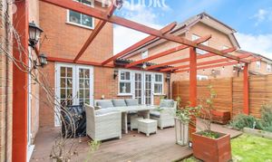 The south easterly facing rear garden is a standout feature. Enjoying a mature tree line and established planting, it offers a wonderful sense of privacy and a natural green backdrop, with no properties behind and direct views over open green space. A central lawn provides plenty of room for children, pets and outdoor living, while well kept borders add interest and structure throughout the year. Directly off the family room, a large decked terrace with a timber pergola creates the perfect spot for al fresco dining or relaxing with friends and family. Paved pathways run around the side of the property, giving easy access to the front via a secure gate. Bright, peaceful and exceptionally private, the garden is ideal for families and anyone who values their own outdoor sanctuary.
