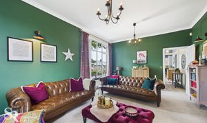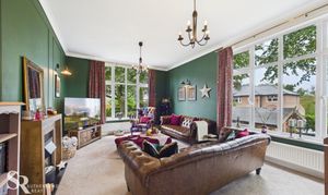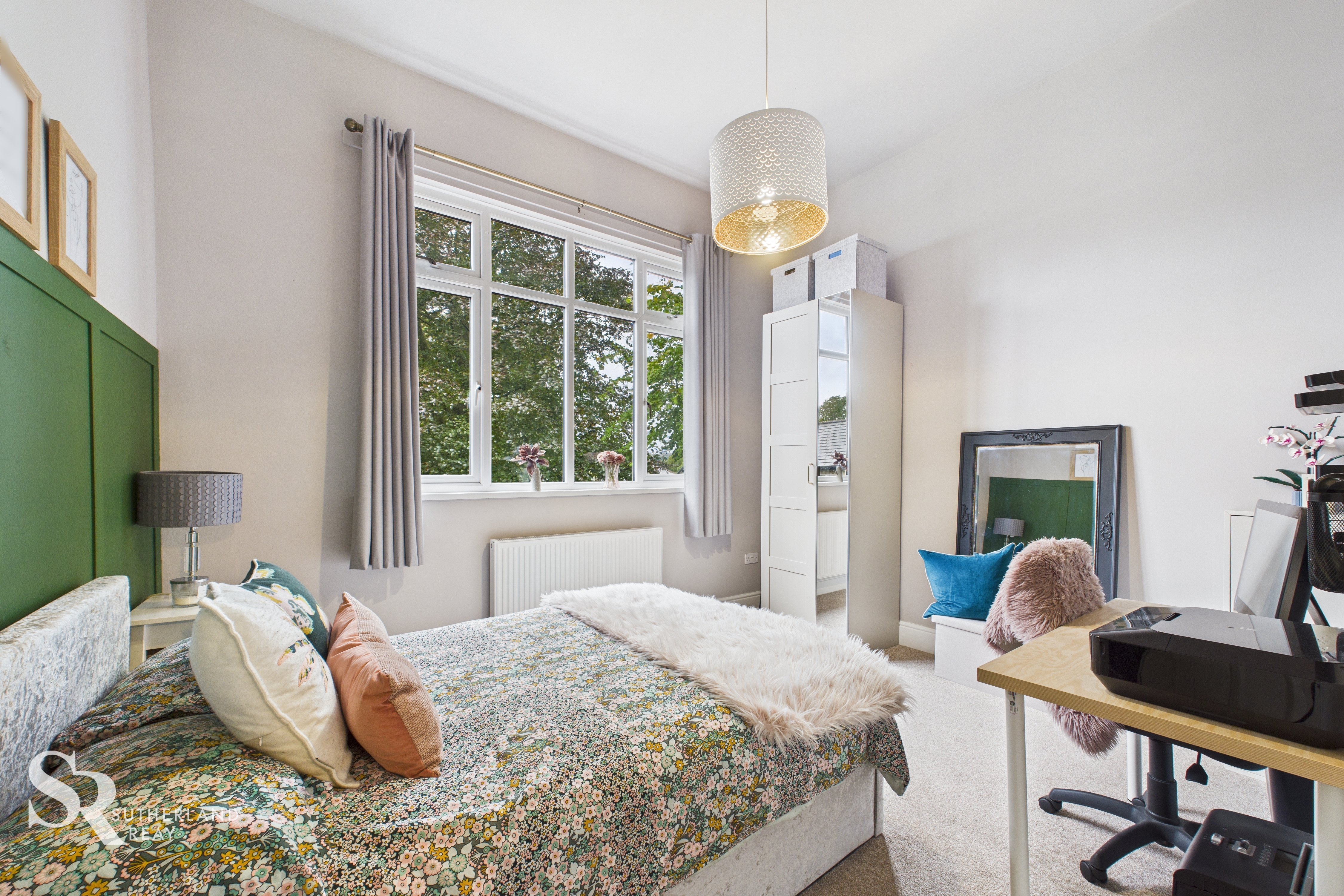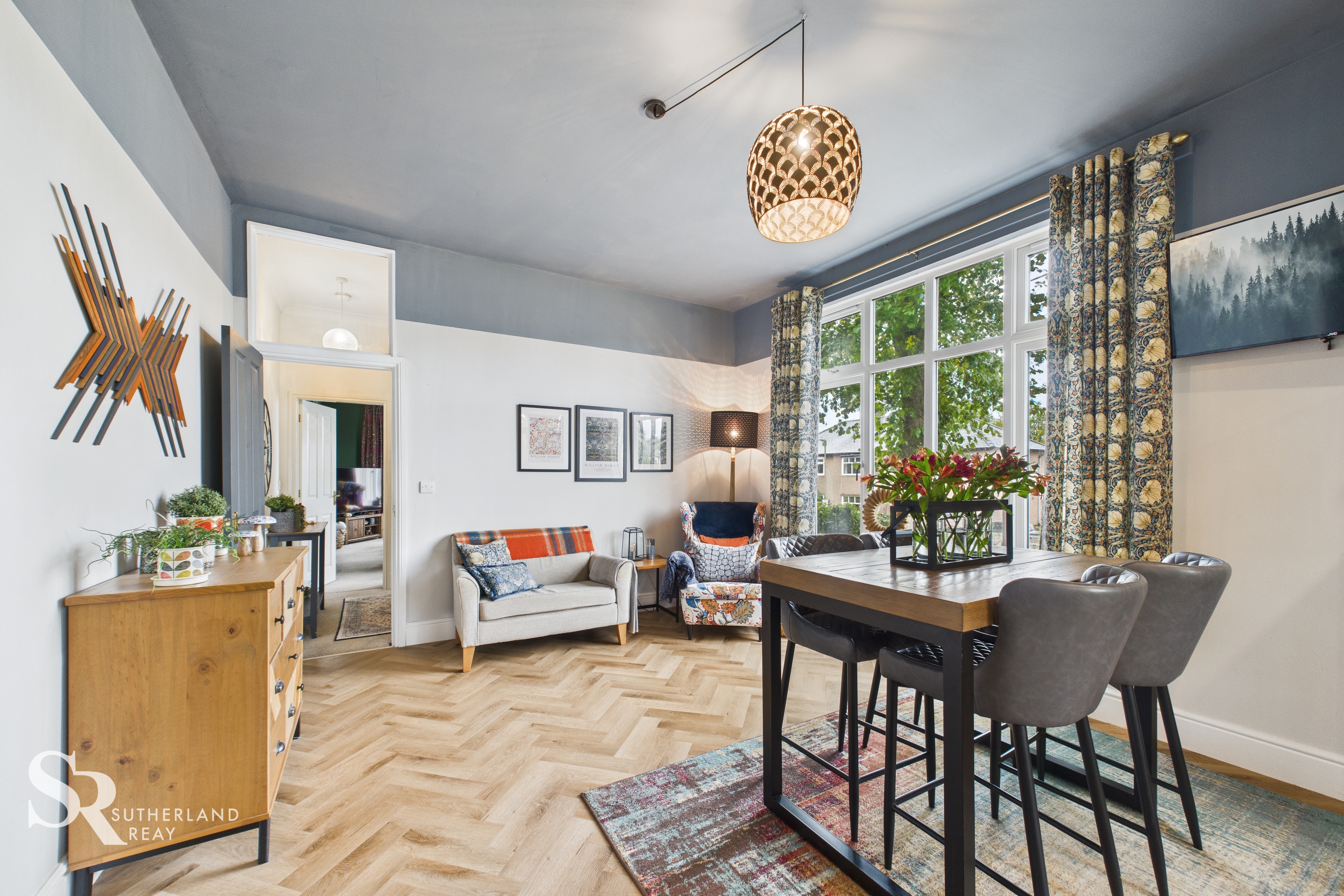 This inviting room is located on the first floor, offering a peaceful retreat. It features comfortable carpet flooring and large dual-aspect uPVC windows that provide plenty of light. The main feature is an electric fire, set on a stone hearth with a wooden mantle surround, placed against a beautifully panelled feature wall that adds a touch of classic elegance.