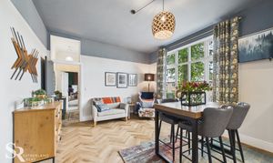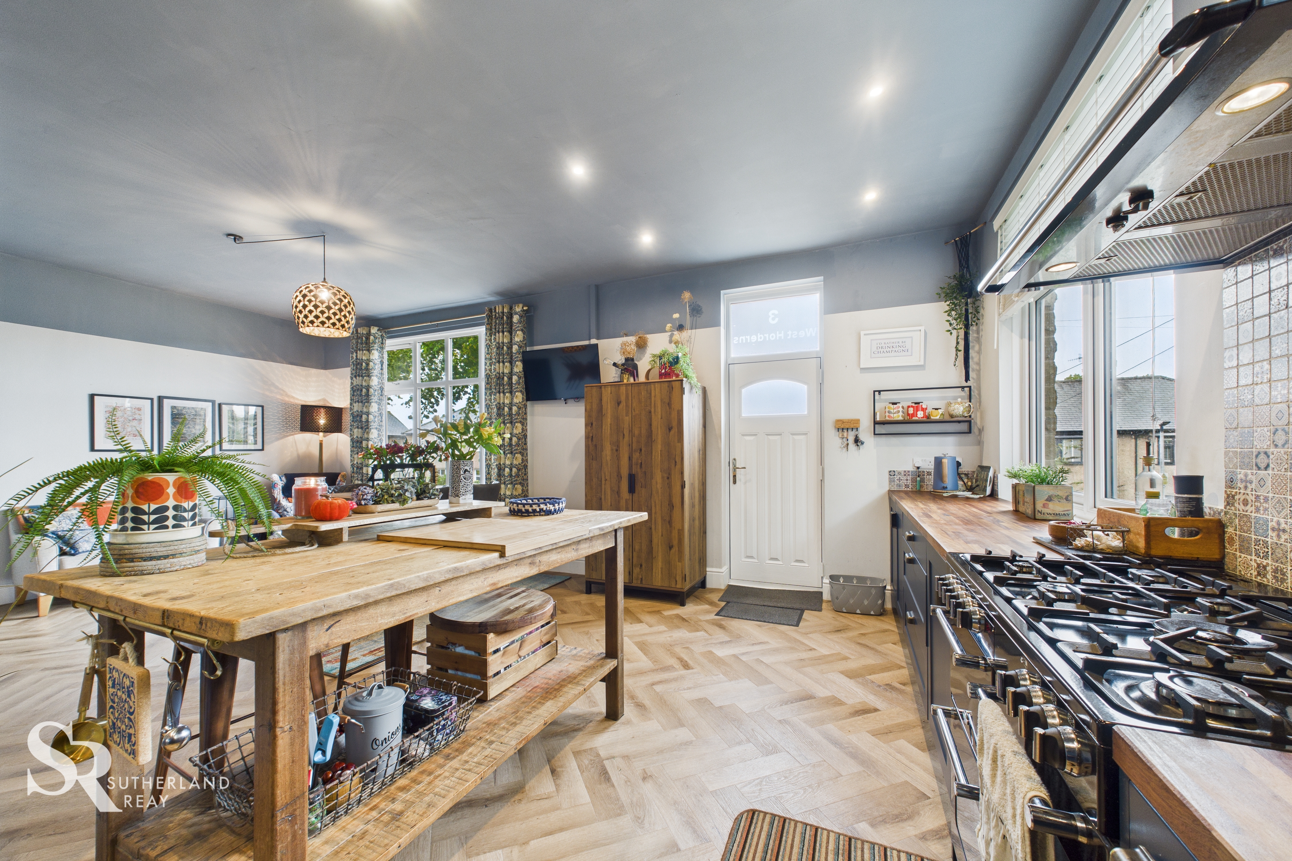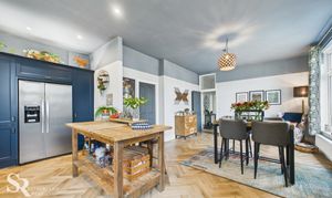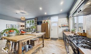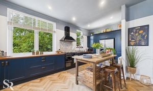Step into this incredible, open-plan space, perfect for modern living and entertaining. Dual-aspect uPVC windows flood the room with natural light, highlighting the luxury vinyl tile flooring laid in a striking herringbone pattern. The kitchen is a true showstopper, with modern wall and base units in a bold blue hue beautifully complemented by contrasting wooden countertops. At the heart of the kitchen is a Belling 7-burner cooker, serving as a stunning focal point. The kitchen also benefits from space for an American-style fridge/freezer and an integrated dishwasher. This versatile space offers ample room for a dining area and a comfortable living space, making it the perfect hub for family life.