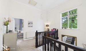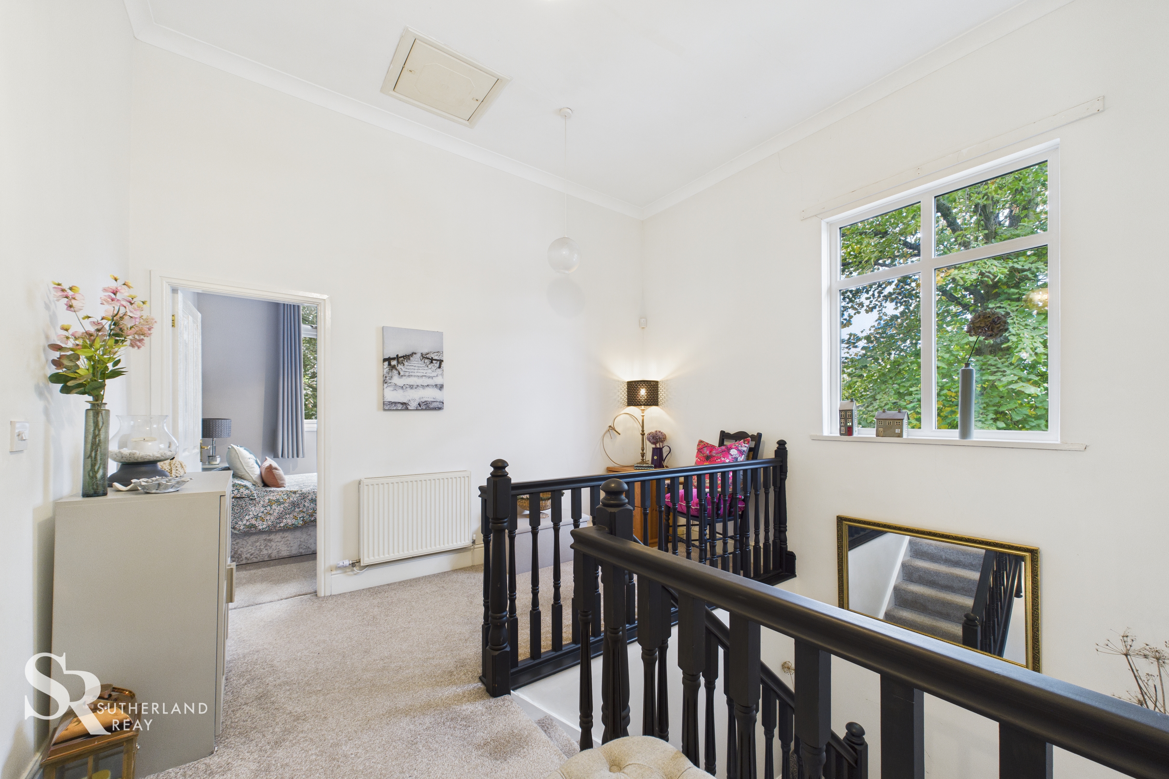 The first-floor landing provides access to the bedrooms and family bathroom. The space features carpet flooring underfoot and is defined by the classic, dark-painted spindles that frame the staircase. A large uPVC window ensures the area is filled with natural light.