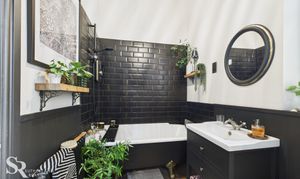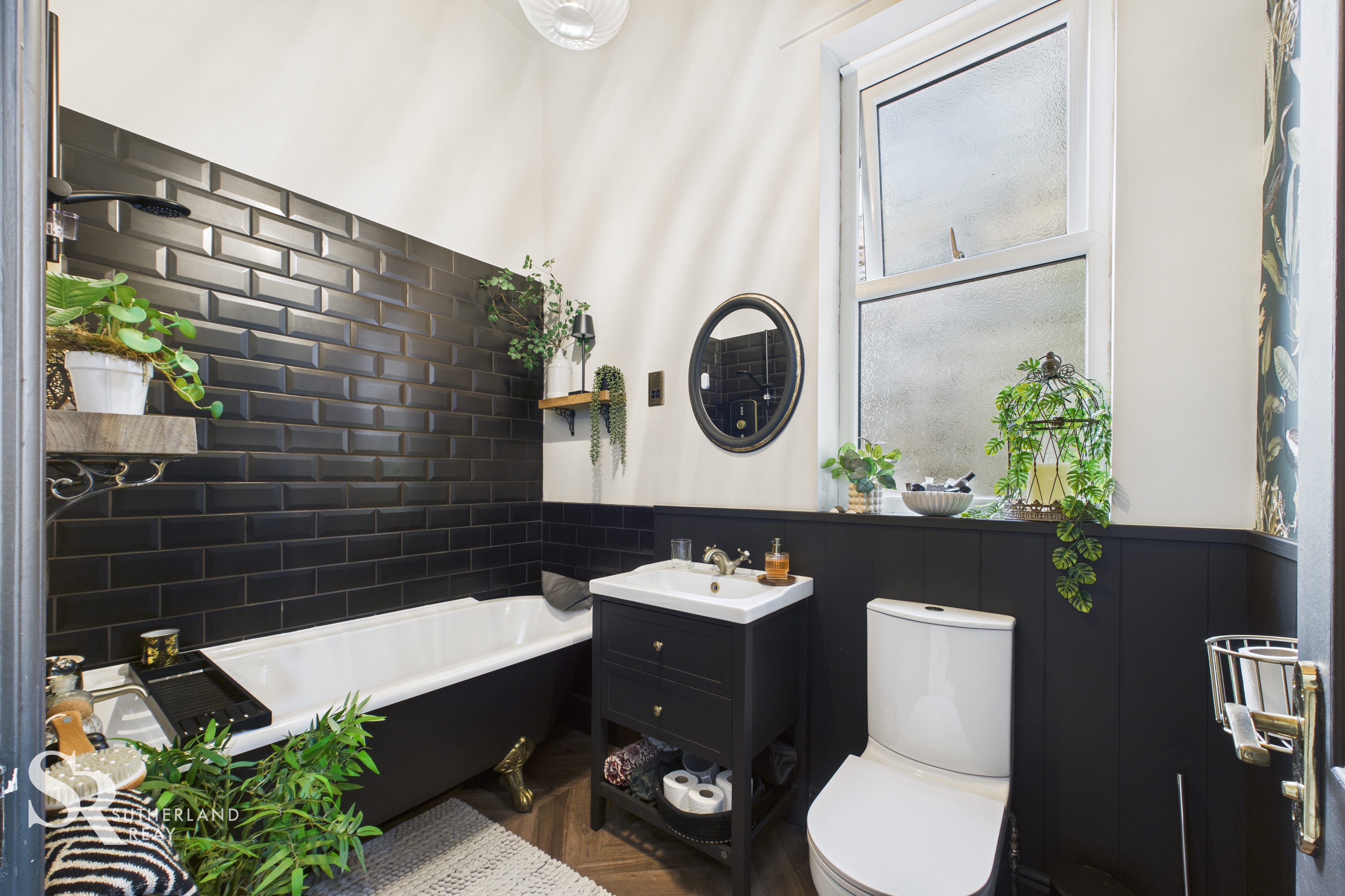 A stylish family bathroom with vinyl flooring and a frosted uPVC privacy window. It features a classic roll-top bath with a modern subway tile surround and an electric shower. Two of the walls are part-panelled, adding a sophisticated, finished look.