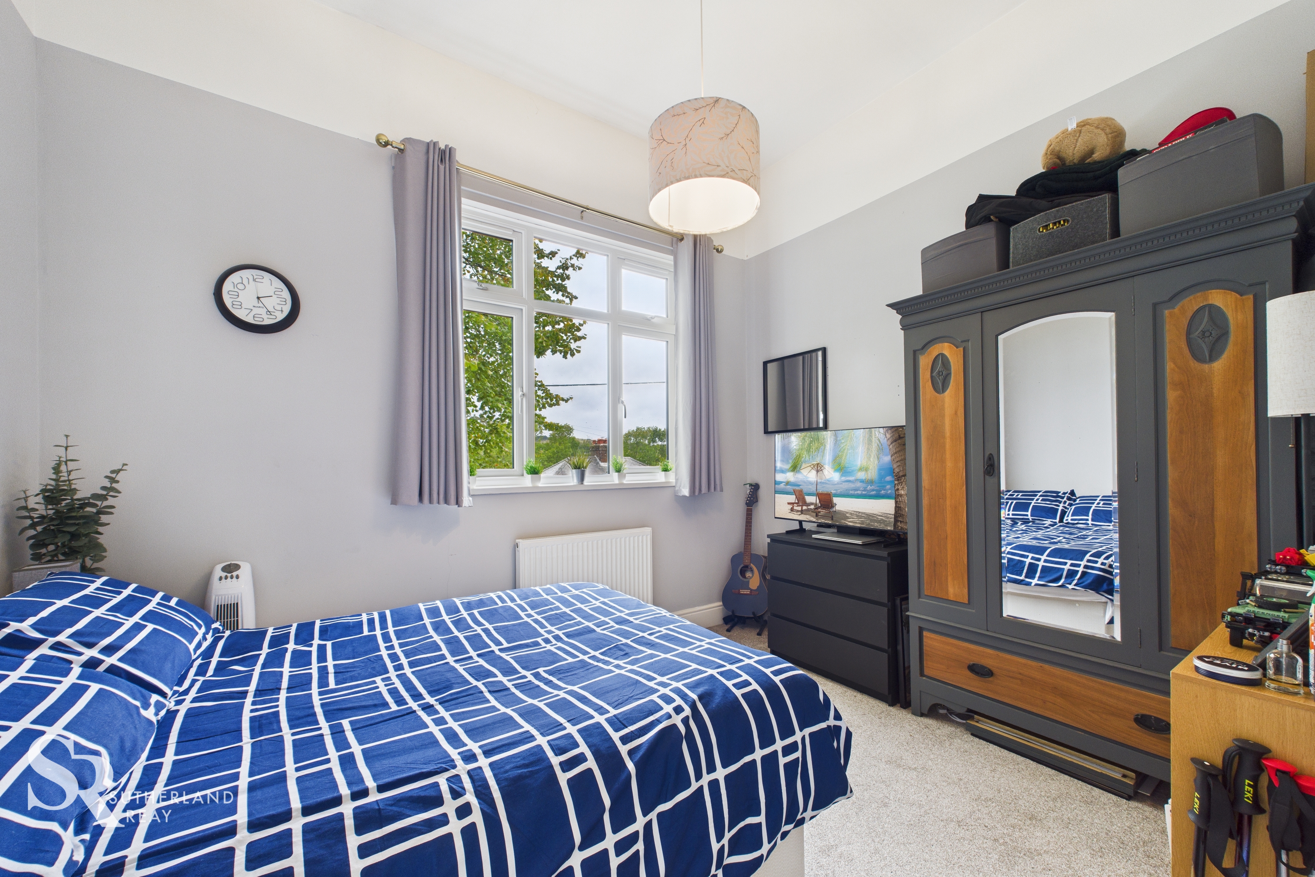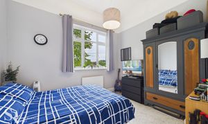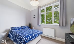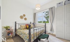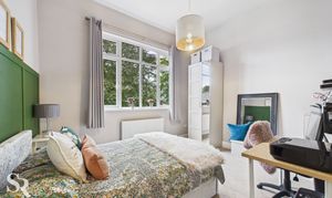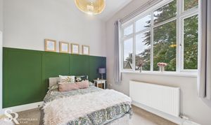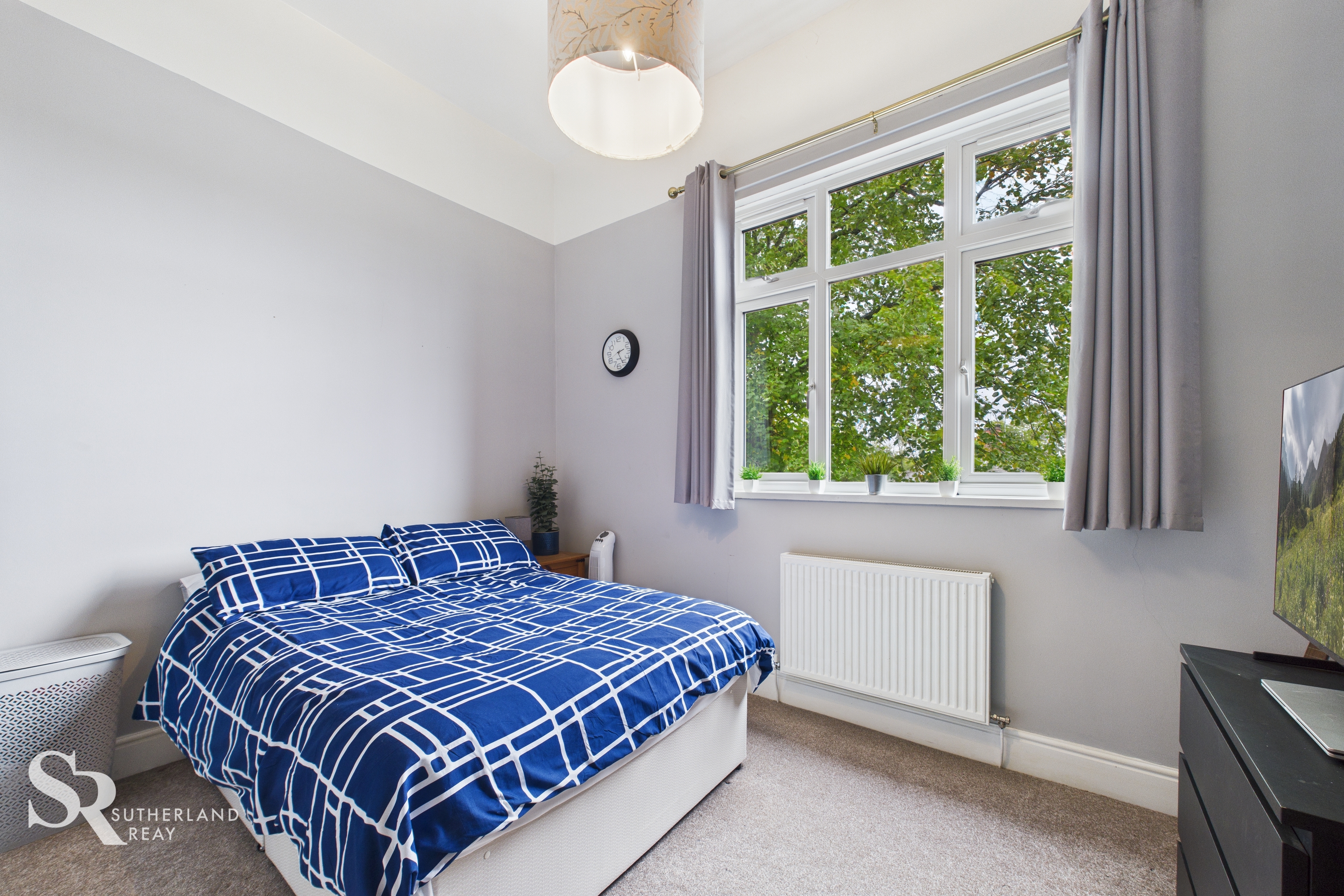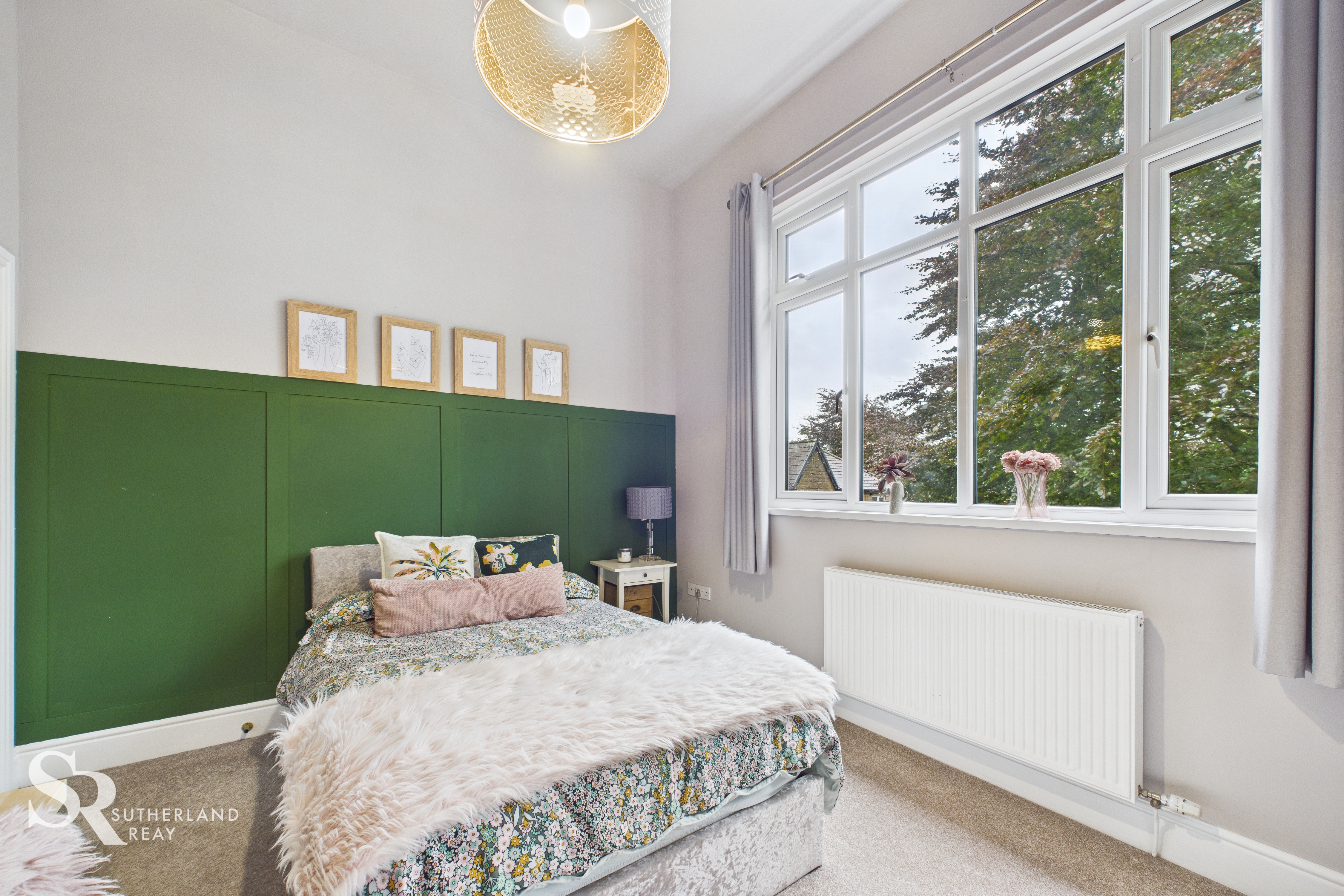 This generous double bedroom features carpet flooring and a large uPVC window. A half-height panelled feature wall adds a touch of character and style to the space.