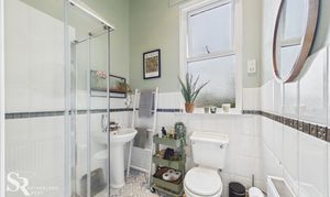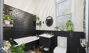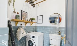 This versatile room is a practical and stylish addition to the ground floor. It features wood flooring and elegant, half-height subway tiled walls. The room is also plumbed for a washing machine, providing a convenient utility area.