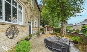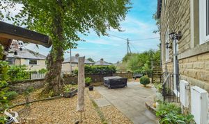 Thoughtfully landscaped to provide a fantastic low-maintenance outdoor space. A generous paved patio area offers the ideal spot for outdoor dining and entertaining, seamlessly extending the living space. The patio is complemented by a crushed stone and gravel border, featuring various mature shrubs and potted plants that add a splash of greenery. The garden is enclosed by well-maintained stone walls and fencing, ensuring privacy.