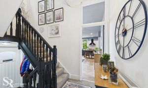 A split-level and welcoming entrance hall with cosy carpet flooring and a composite front door with a frosted doorlite. A discreet access door leads to a fantastic underfloor storage area that extends across the entire footprint of the open-plan kitchen/living area, offering an incredible amount of storage. Carpeted steps lead up to a carpeted landing and staircase, which features classic, dark-painted spindles, guiding you to the first floor.