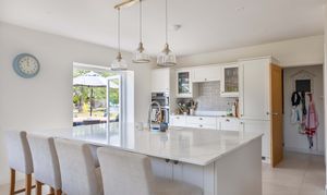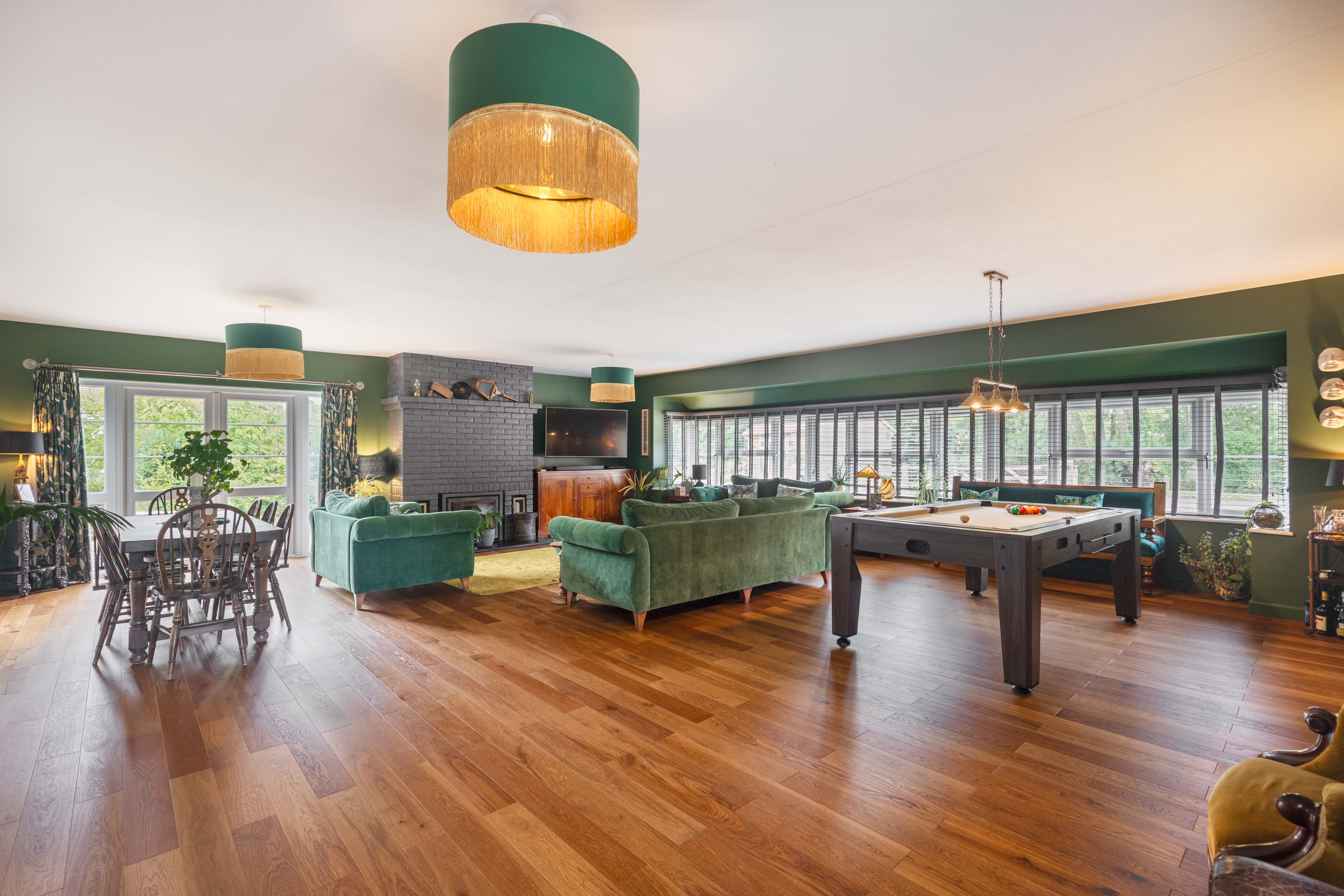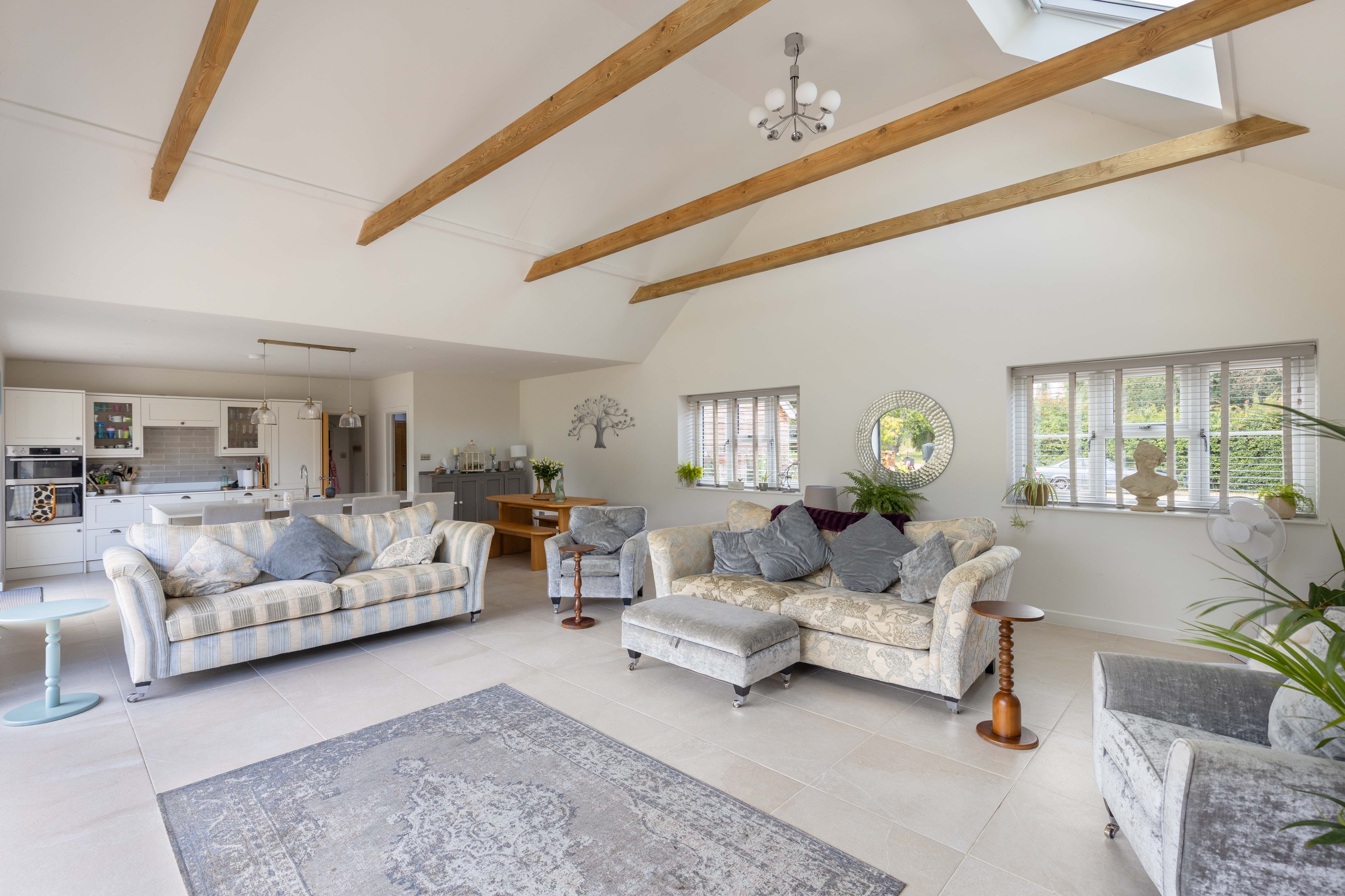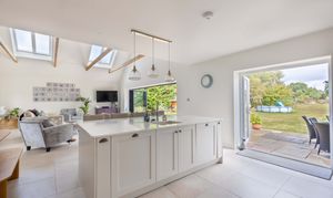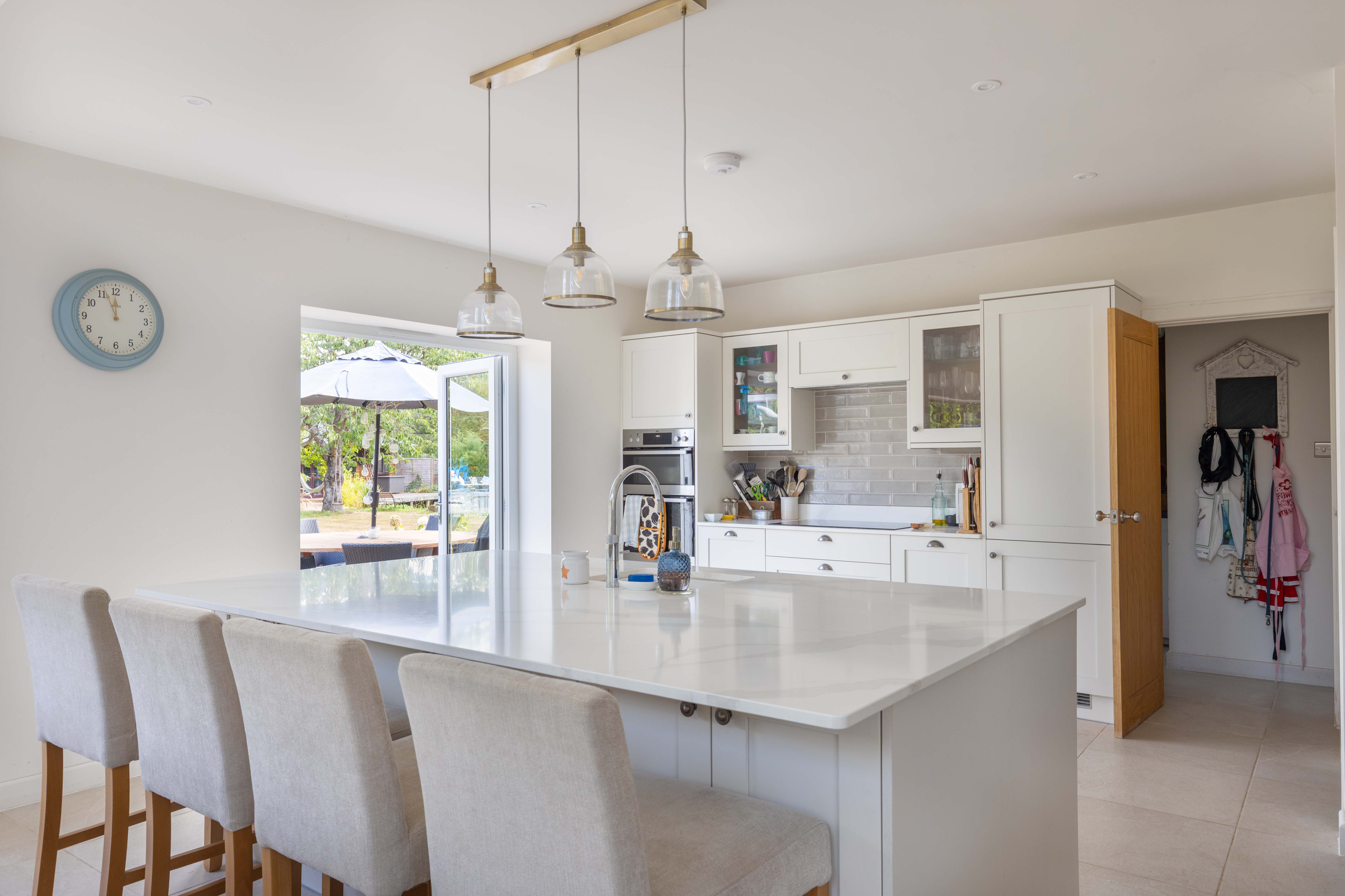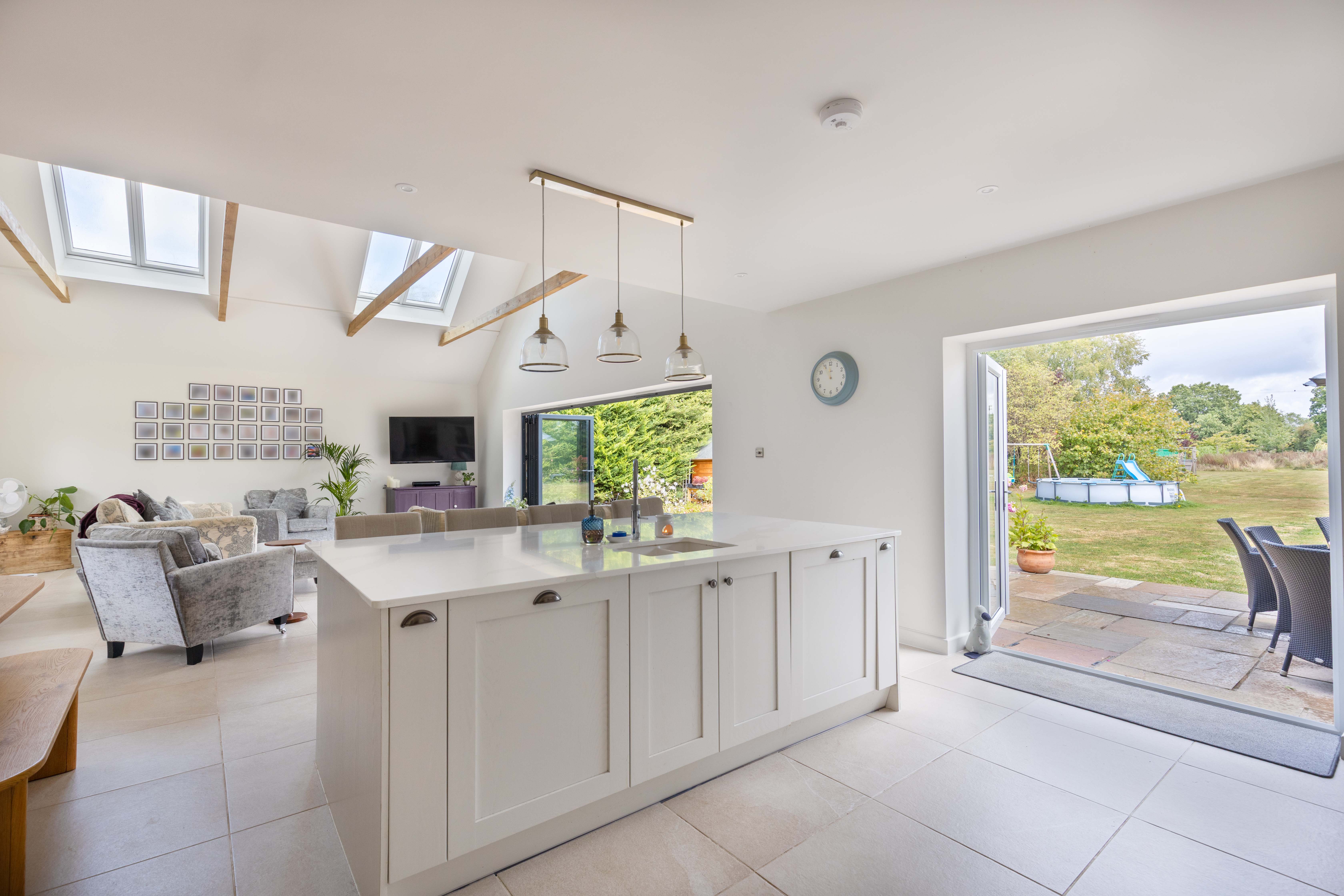 The large hallway creates a welcoming entrance to the property, with a large double cupboard for coats and shoes. To the front of the house, double doors open to the fabulous living room which is an amazing space for entertaining friends and family and has hosted many a Christmas get together with ease. This triple aspect room, measuring 29’10 × 26’4 has doors to the garden and is fitted with a woodburner to feel cosy in the winter. The 36’8 kitchen/dining/family room is across the rear of the property, with vaulted ceiling with rooflights, windows to the front and bi-fold and patio doors to the rear garden making this an incredibly light and bright space with a seamless connection with the gardens. The kitchen area is fitted with attractive, shaker-style units with Quartz worksurfaces incorporating a breakfast bar, and integrated appliances include an eye-level double oven, induction hob, fridge/freezer and dishwasher, together with a Quooker hot water tap. There is also a useful pantry providing additional storage. Off the hallway, there is a guest cloakroom as well as a utility/boiler room which has space for a freestanding washing machine and tumble dryer.
