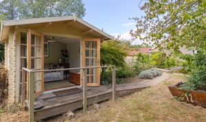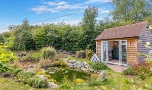 A garden office enjoys a beautiful view over a calming water feature and attractive planting, with the path leading around to a separate summer house. Overlooking the pond, is a large timber outbuilding which comprises a spacious studio and three office areas, with attached shower room with external access. Last, but not least, is a further timber garden studio and there are additional timber garden sheds tucked away behind a fenced, working area of the garden, providing plenty of useful storage.