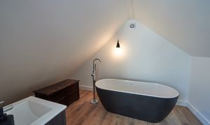 The master bedroom is a generous double room, with en-suite featuring a shower-bath, wash basin and WC. There are two further double bedrooms, one having an en-suite shower room. We understand from the owners, that there is also potential to extend into the attic space to create additional bedrooms and bathroom, from an existing planning consent, if required. The property has underfloor heating throughout, powered by an air source heat pump.