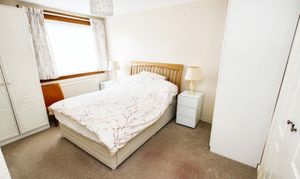 A well proportioned third bedroom which also features over-stair storage cupboard. Neutral decor and carpeting.