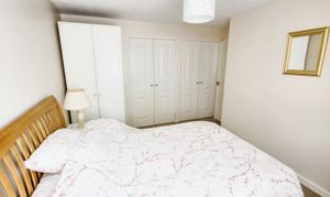 A delightful calm room featuring neutral decor and carpeting. The room allows ample space for a configuration of furniture. There is built in wardrobe storage to the rear.
