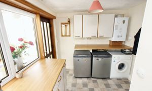 Featuring a range of base and wall units with contrasting work-surfaces. Additional built in cupboard. Plumbing for appliances. UPVc door providing access to the Conservatory.