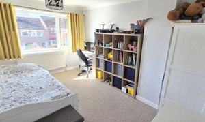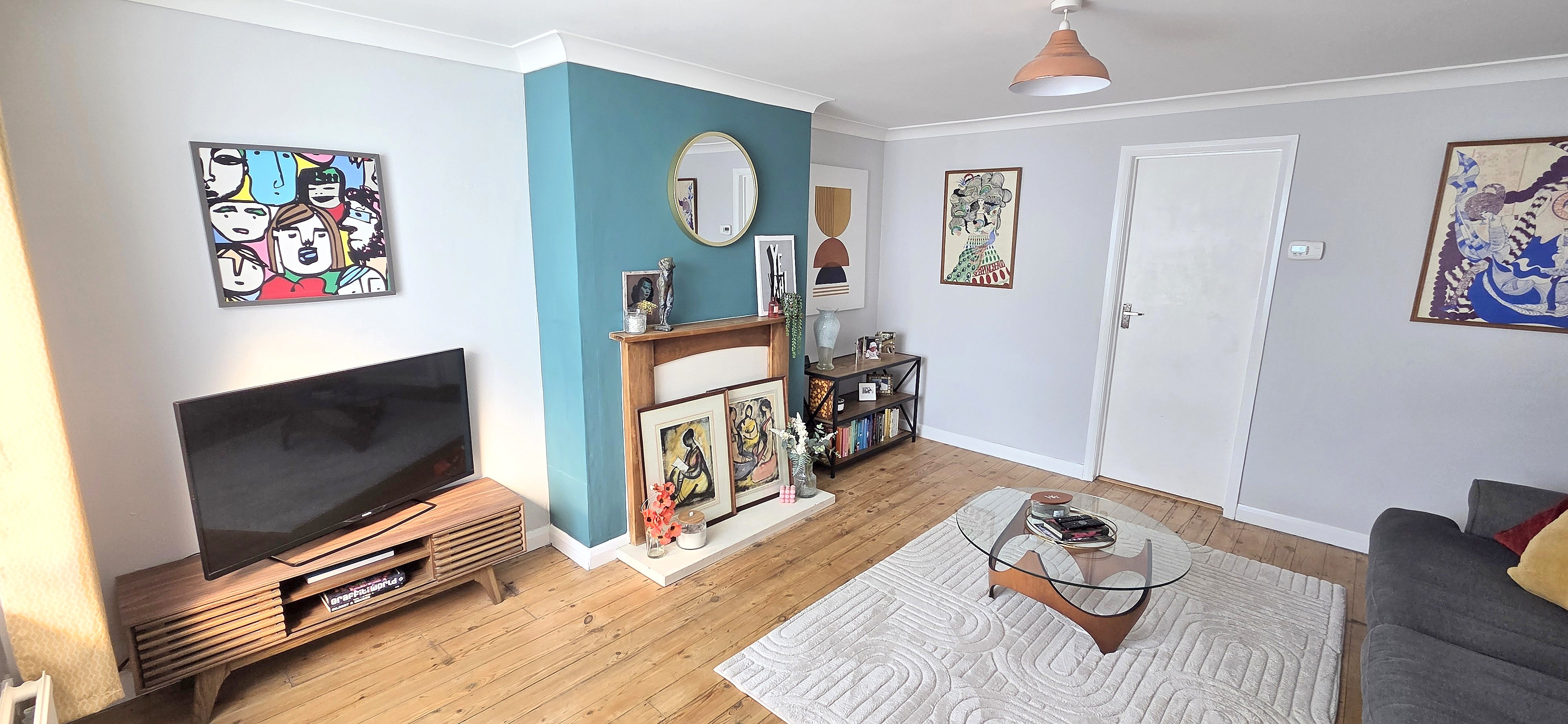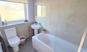 First Floor - landing with loft hatch, pull down ladder, part divided with stud wall into Potential Study Space with front Velux window (potential for loft conversion, subject to any consent). 3 Bedrooms (2 Doubles and 1 Single) and Family Bathroom re-fitted with a modern white suite (2025).