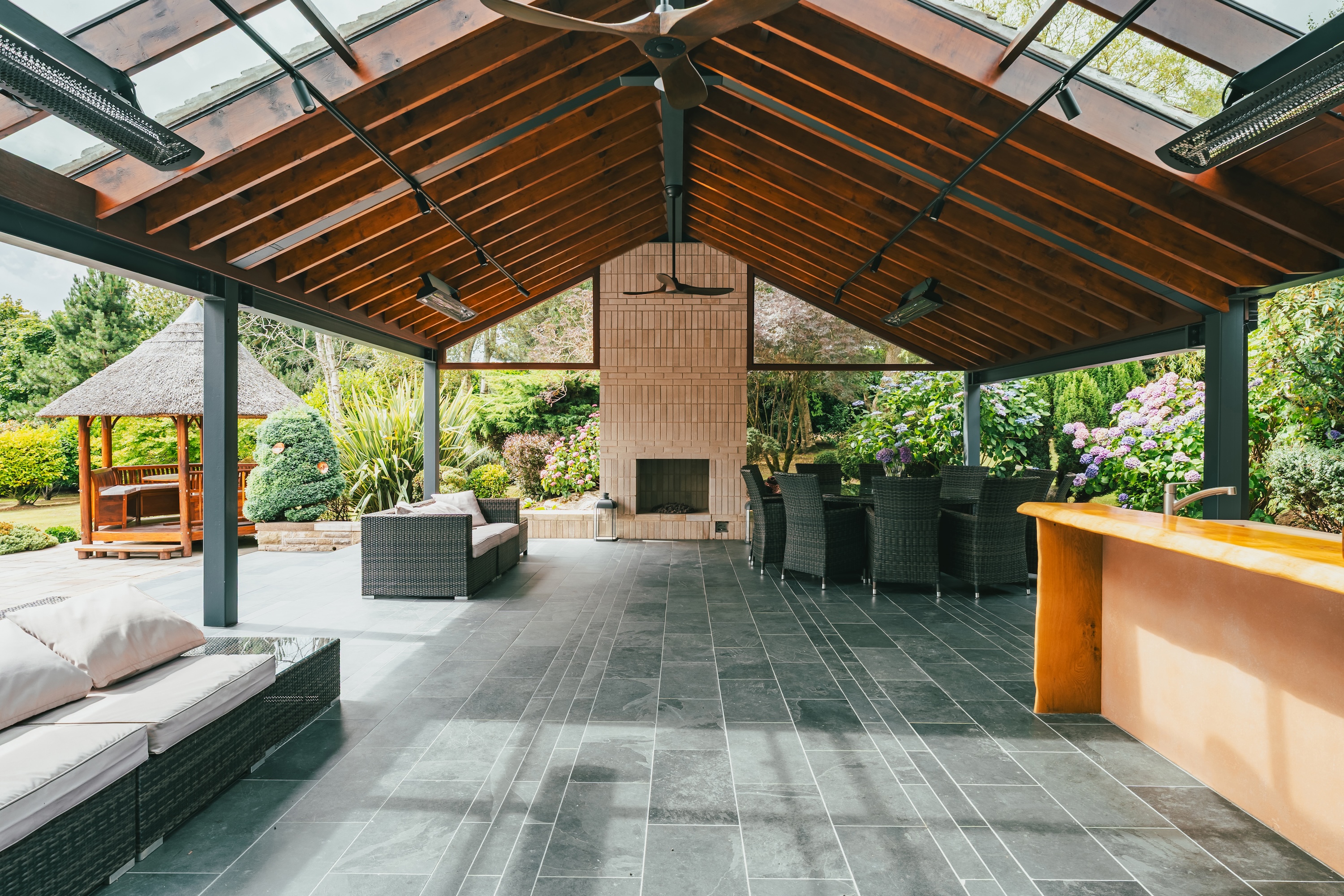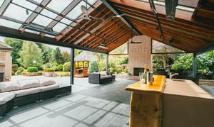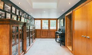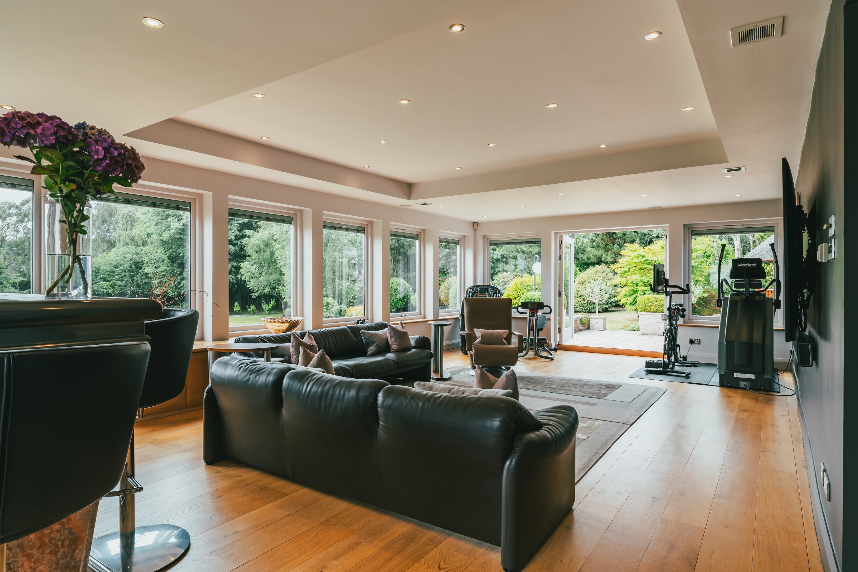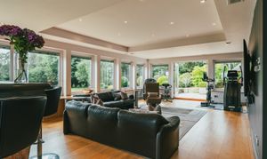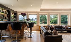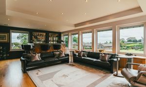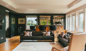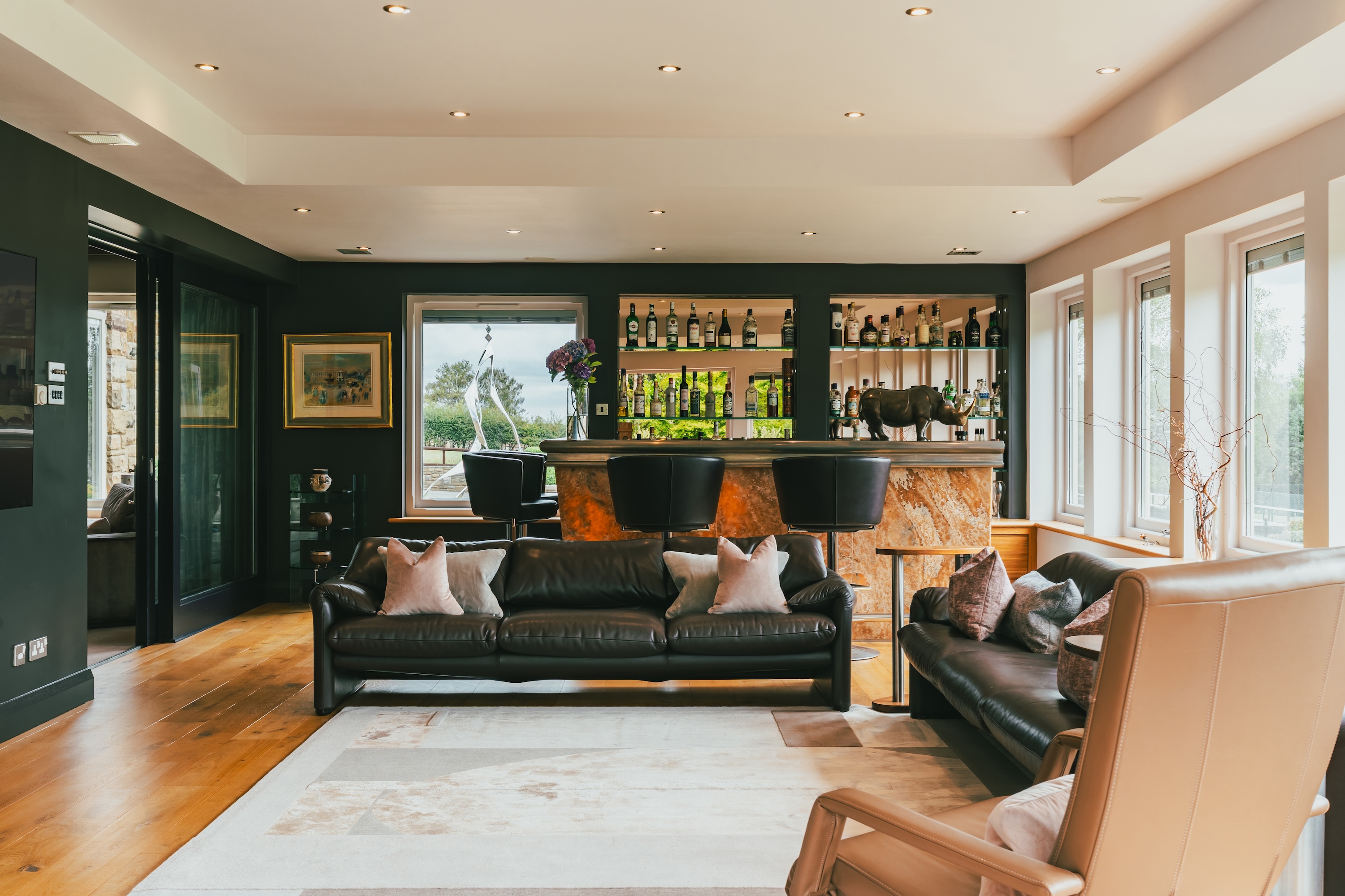 Internally, the accommodation offers excellent versatility. The spacious sitting room enjoys views across the gardens, while a remarkable lounge/bar area provides a dedicated entertaining space featuring a commercial-grade illuminated marble bar with zinc surfaces and integrated preparation areas.