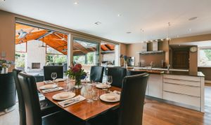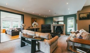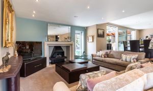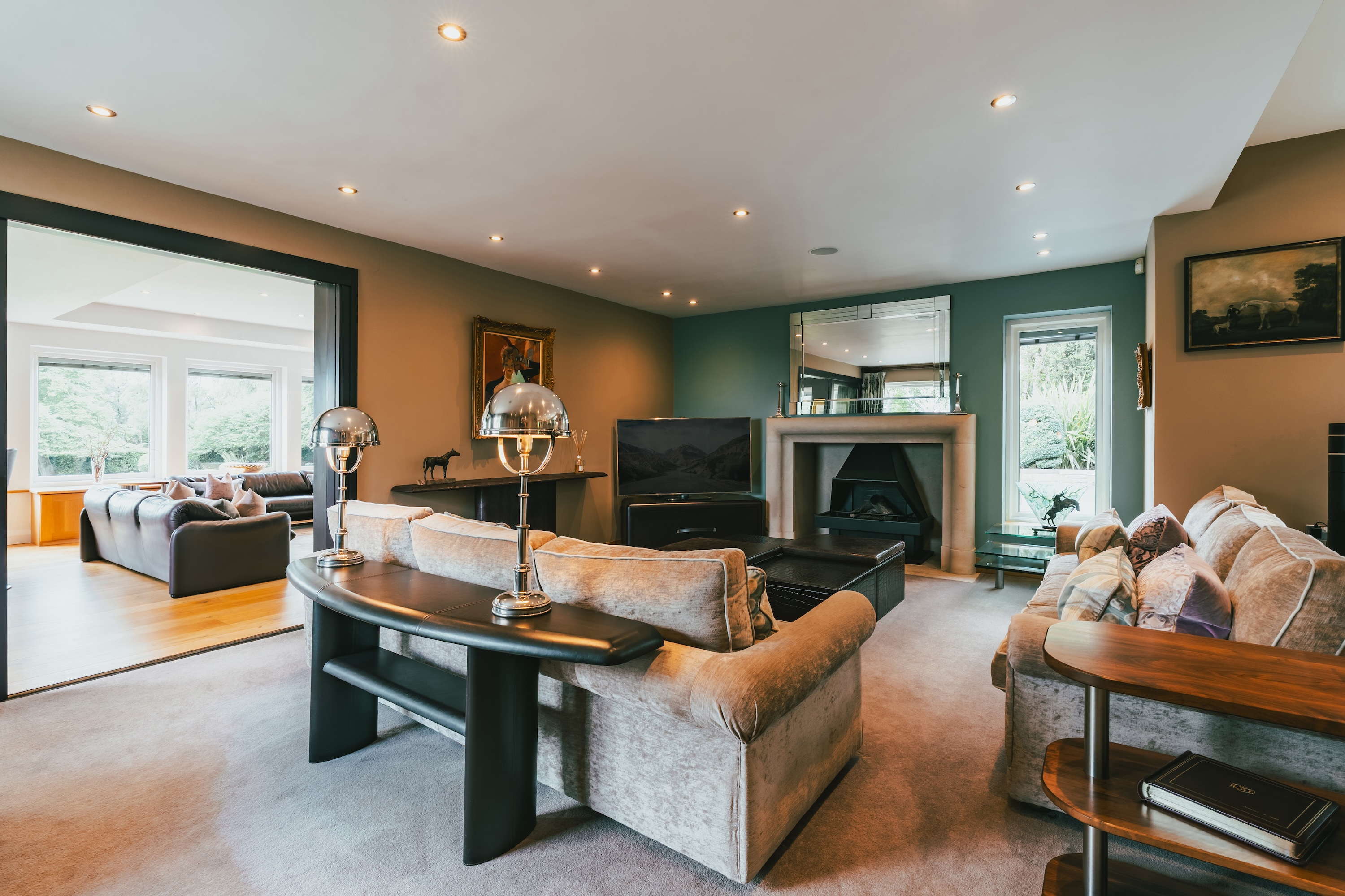 Finished to an impressive specification throughout, the home has been thoughtfully designed to combine contemporary comfort with superb entertaining space. At the heart of the property is the outstanding open-plan dining kitchen and sitting room, an expansive living area perfectly suited to modern lifestyles. The kitchen is comprehensively fitted with high-end Gaggenau appliances, extensive cabinetry and a central island incorporating seating, while large sliding doors create a seamless connection to the outdoor entertaining terrace.