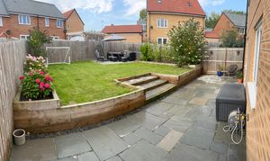 Externally, the property benefits from ample driveway parking leading to the garage. To the rear, there is a patio area with raised railway sleeper borders, a turfed lawn and planted shrubs, creating an attractive outdoor space.