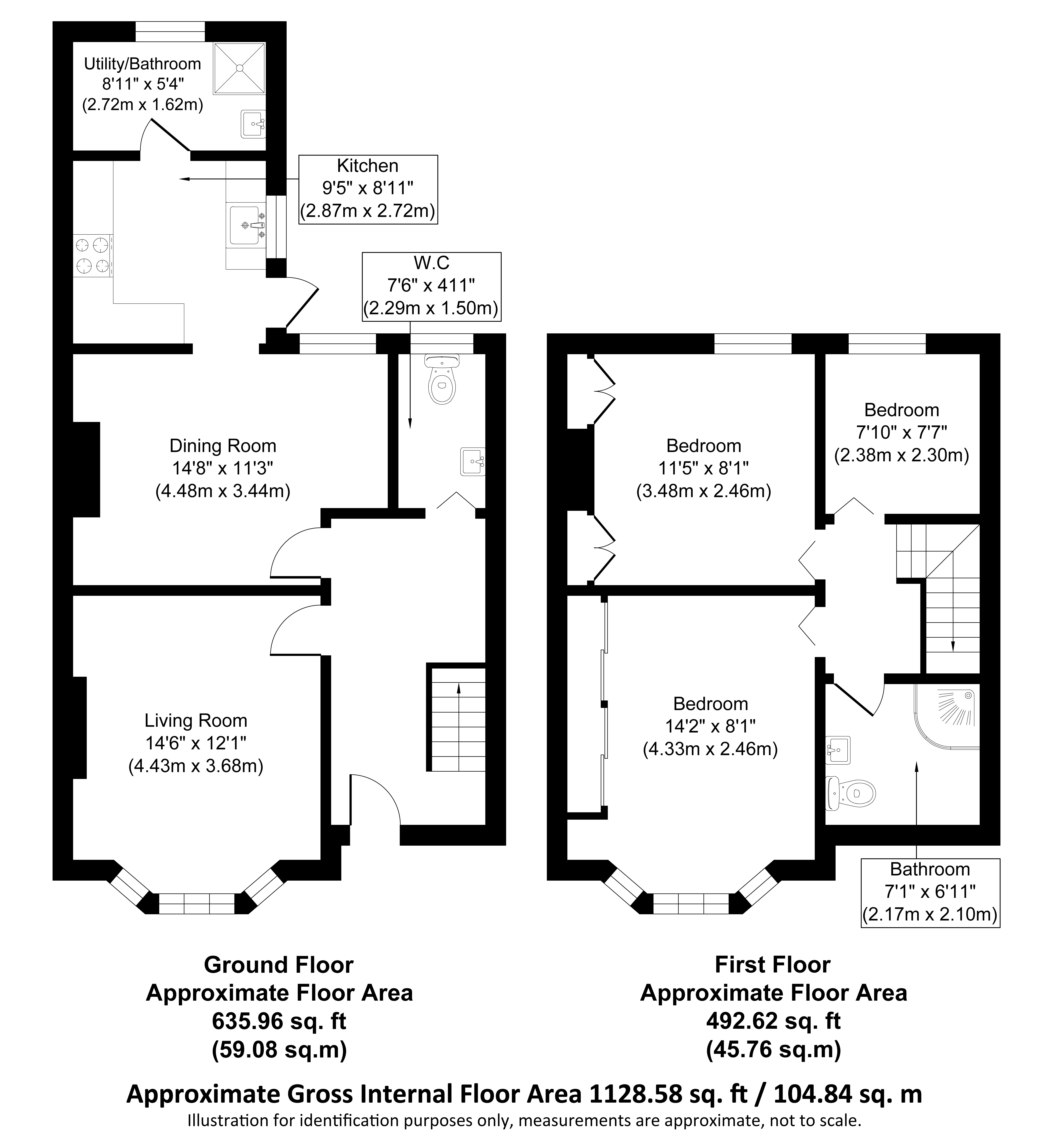 The bay-fronted living room measures approximately 14'6 x 12'1, creating a bright and comfortable main reception space. The second reception room measures approximately 14'8 x 11'3 and works well as a dining or family room, with a pleasant outlook towards the garden and direct access through to the kitchen.