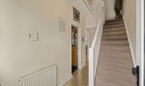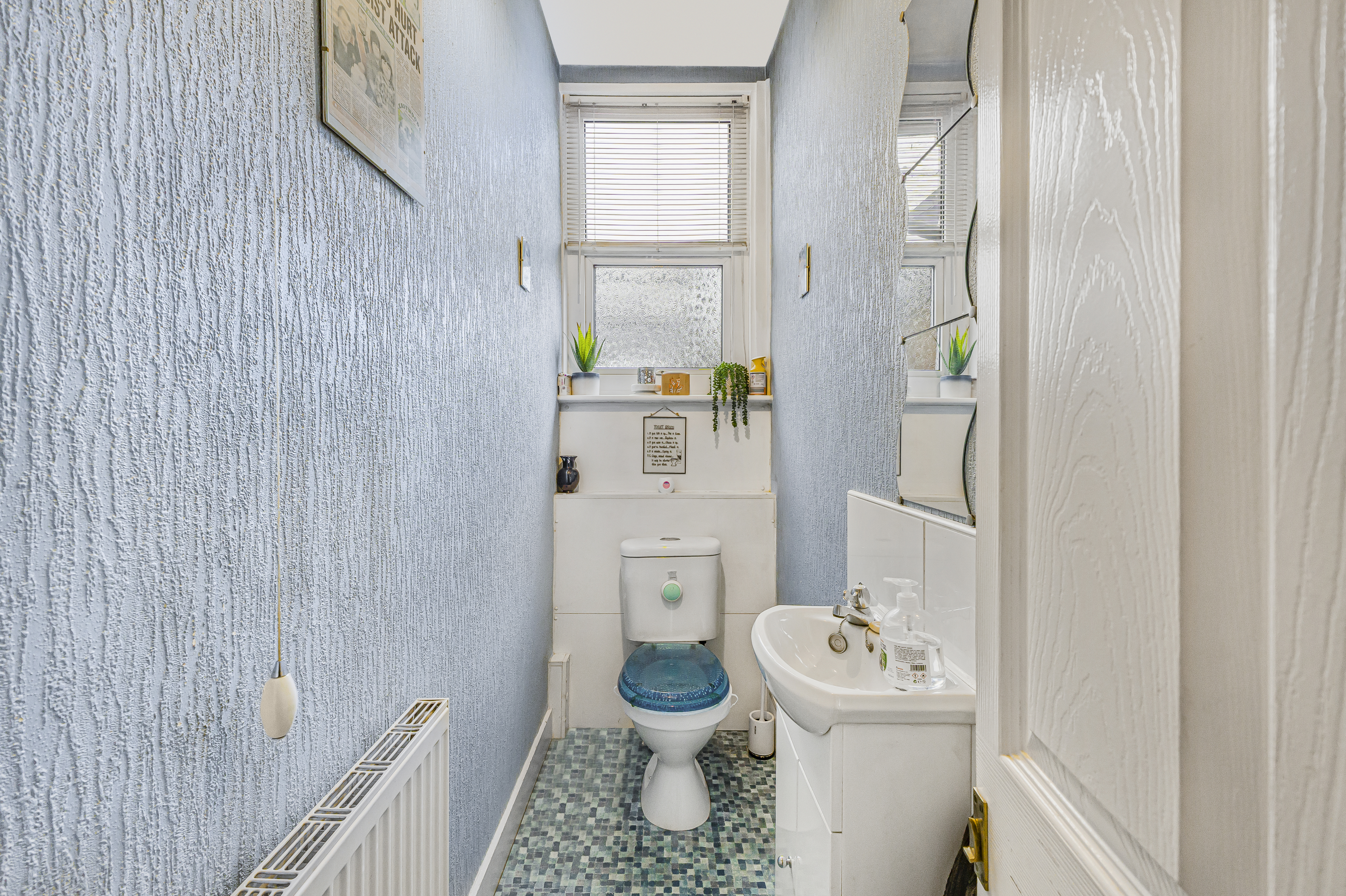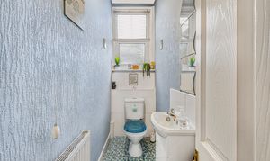 The storm porch opens into a practical entrance hall with ample room for coats and shoes. From here, doors lead to both reception rooms and a spacious ground floor cloakroom/WC measuring approximately 7'6 x 4'11, fitted with a modern two-piece suite and vanity storage.