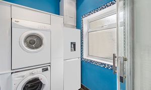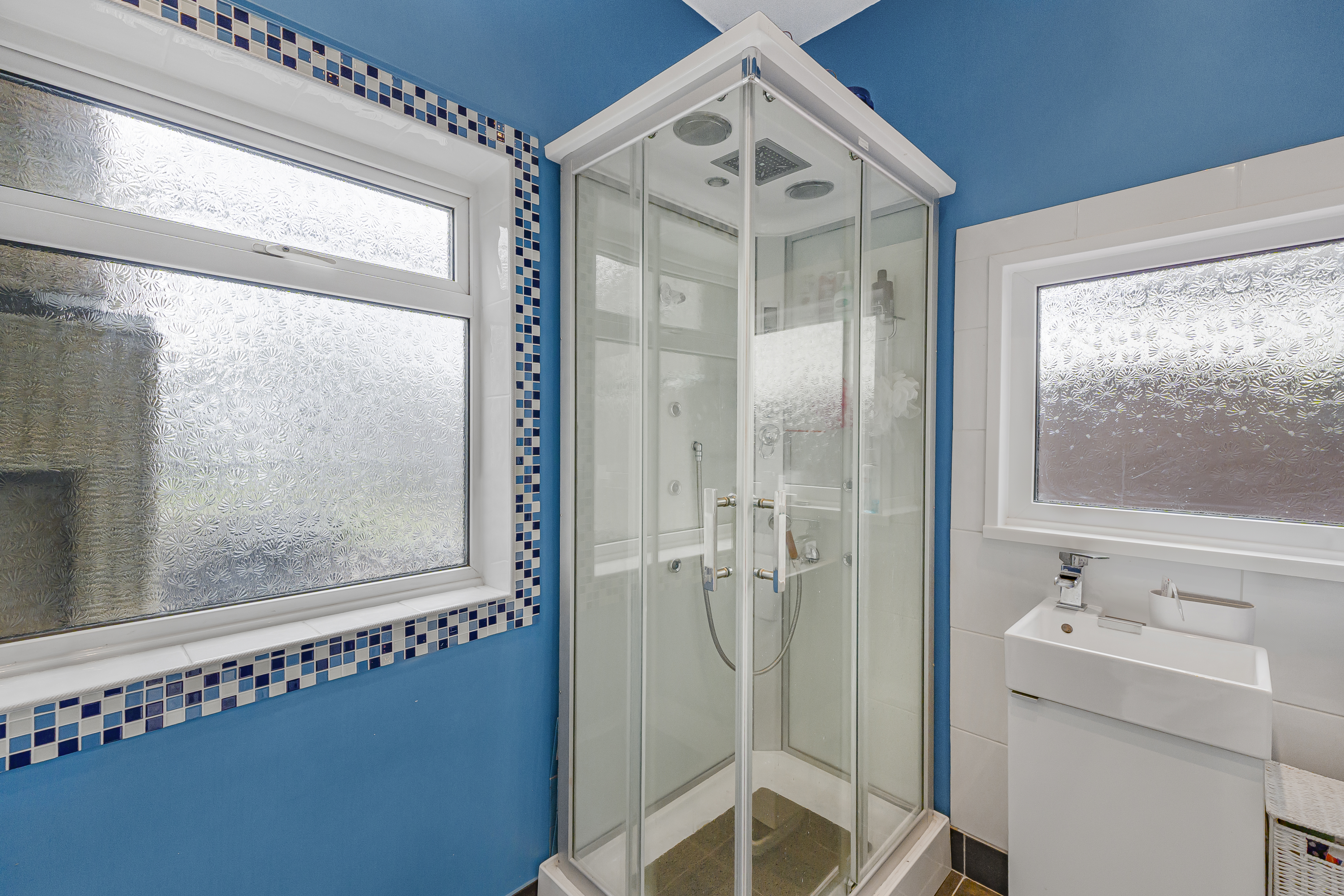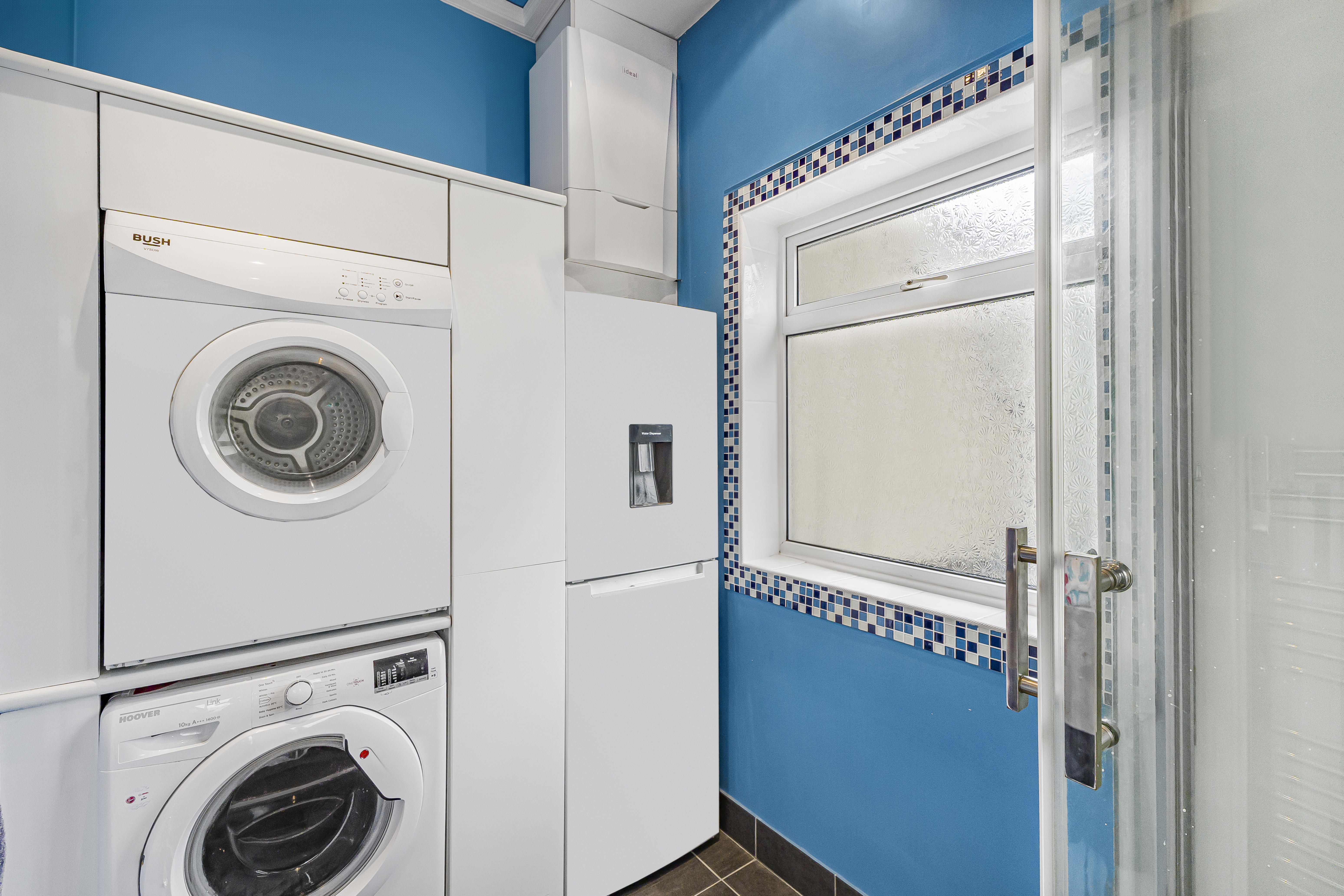 To the rear is a highly useful utility/shower room measuring approximately 8'11 x 5'4, which doubles as a second bathroom and utility space. It offers plumbing and space for both a washing machine and tumble dryer, room for a tall fridge/freezer, built-in storage, a modern combi boiler and a full enclosed shower cubicle.