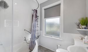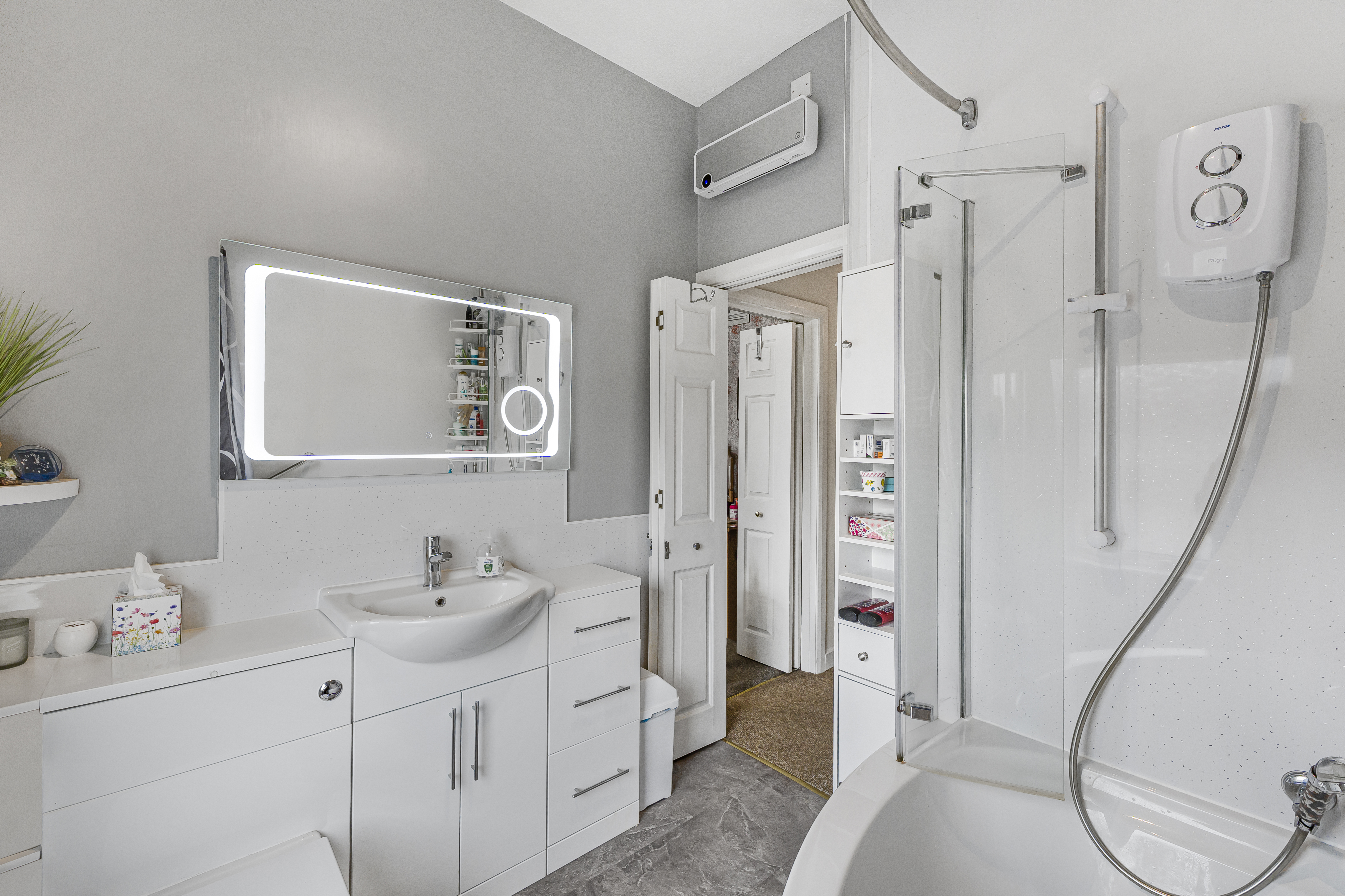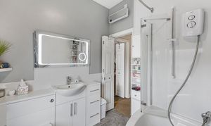 The first floor bathroom measures approximately 7'1 x 6'11 and is a bright, modern space fitted with a corner bath with shower over, vanity storage, floating WC, heated towel rail and additional storage.