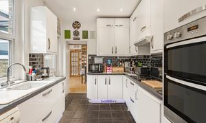 The kitchen measures approximately 9'5 x 8'11 and is fitted with a practical range of units and worktop space, along with a comfortable-height double oven, electric hob and integrated extraction.