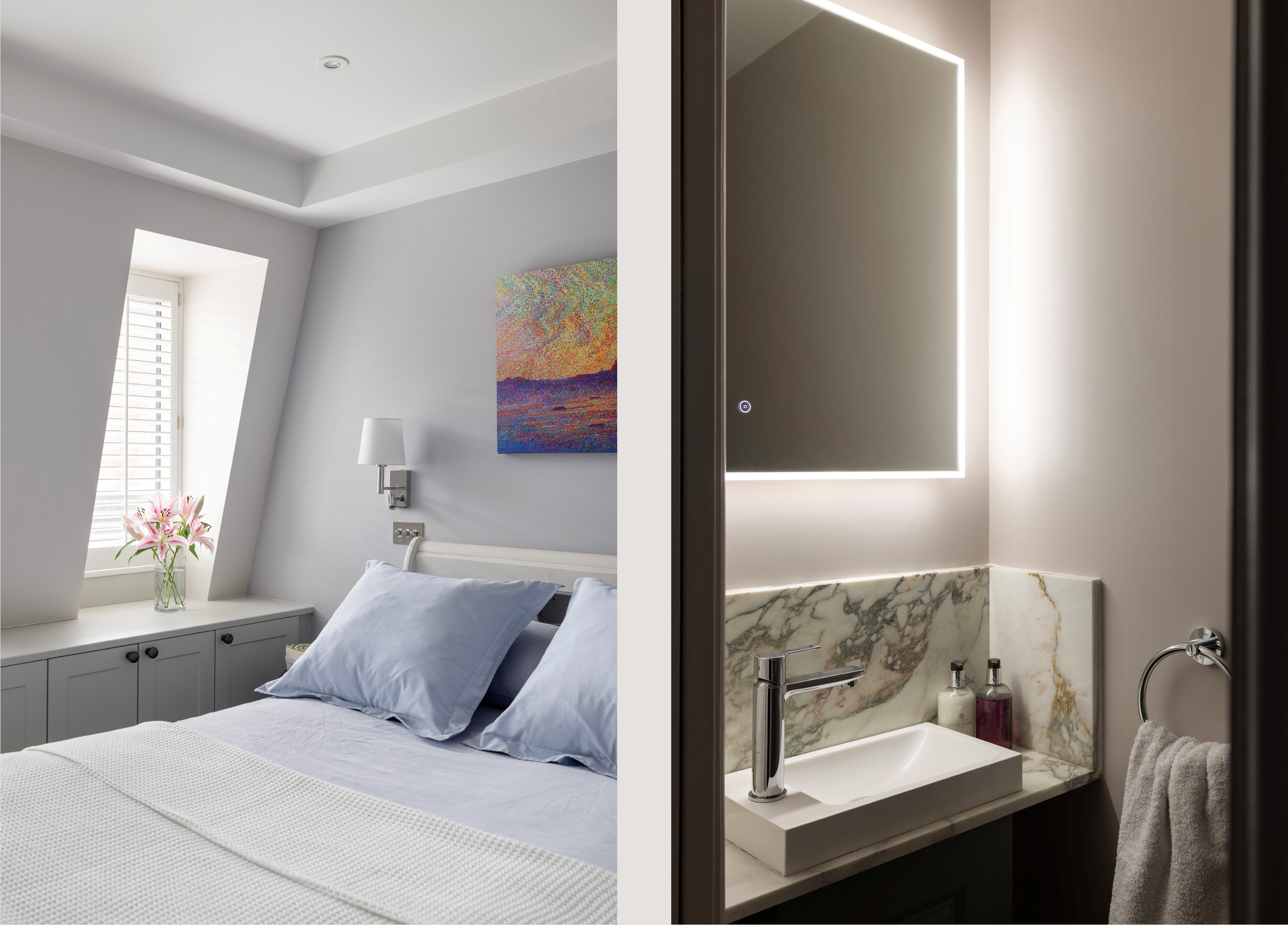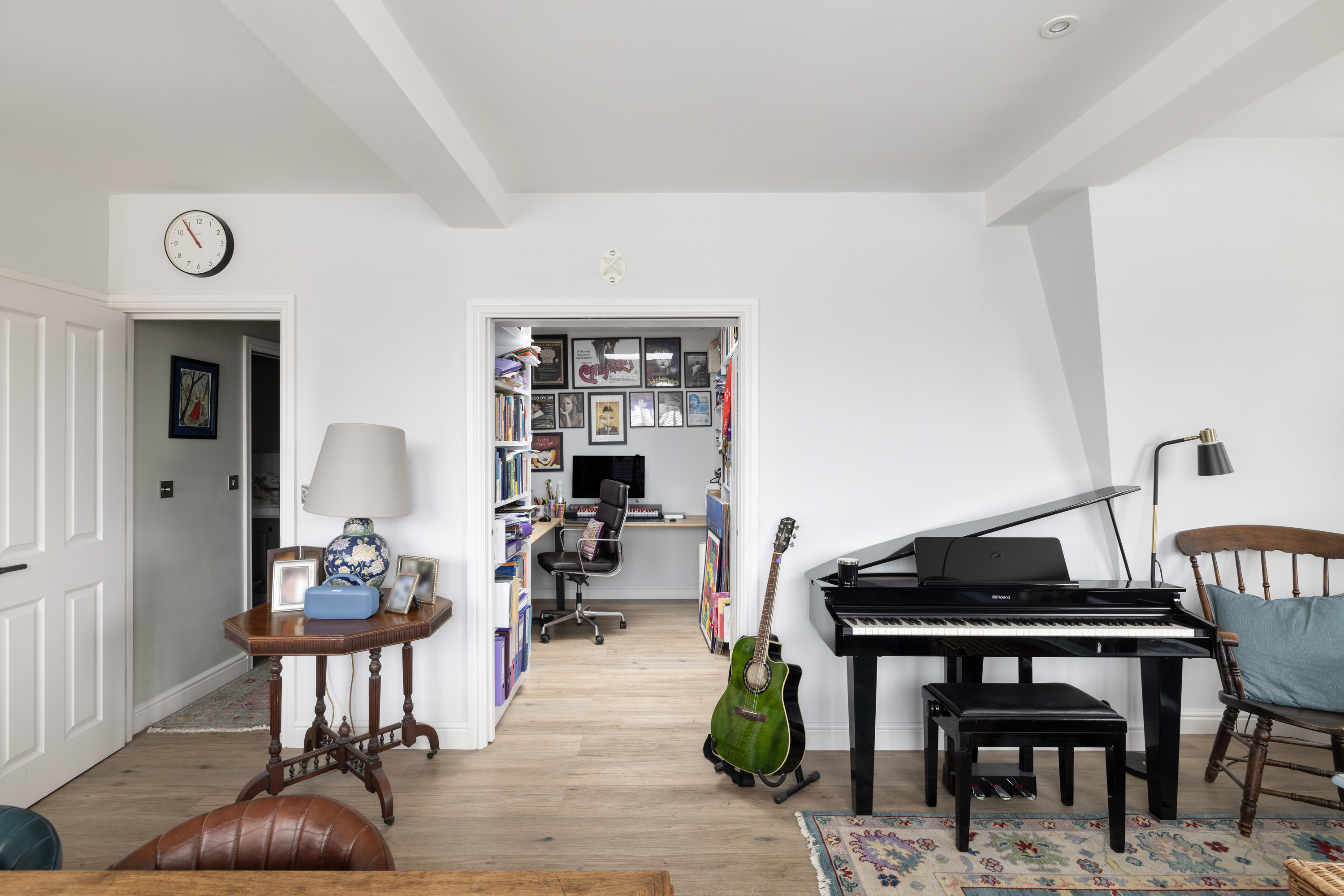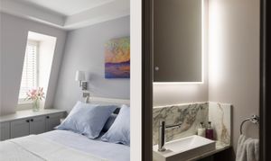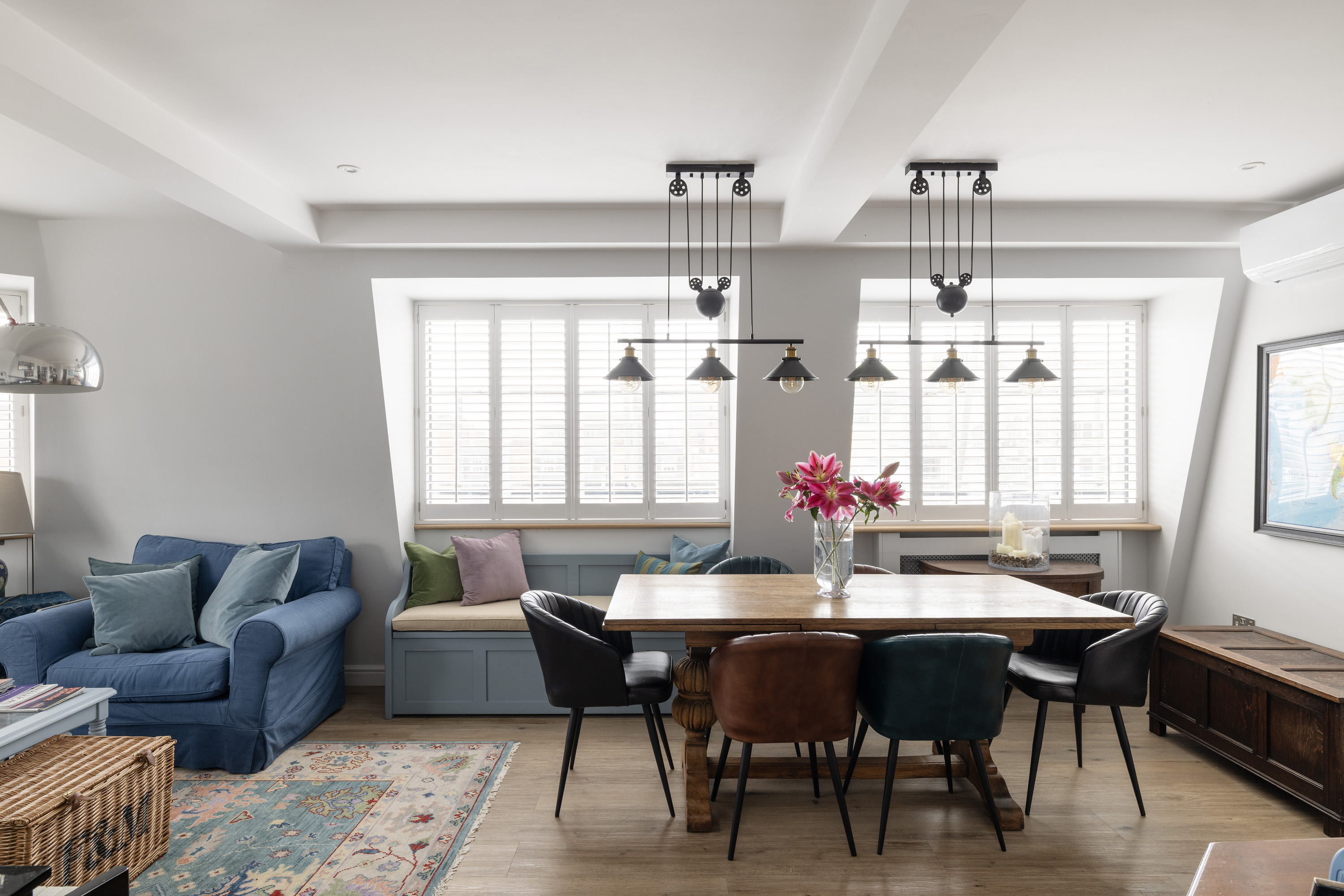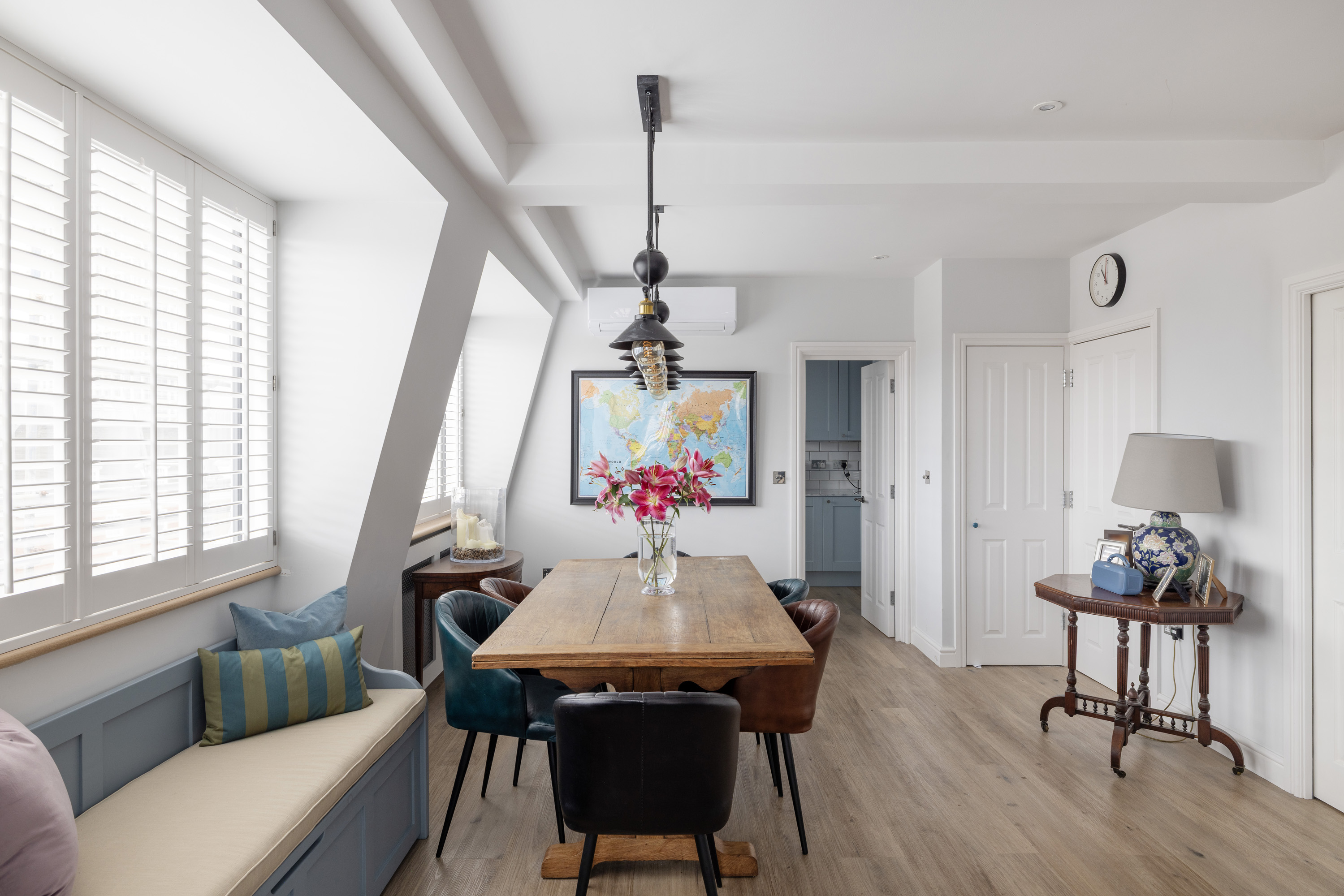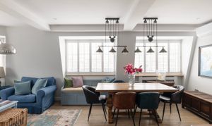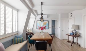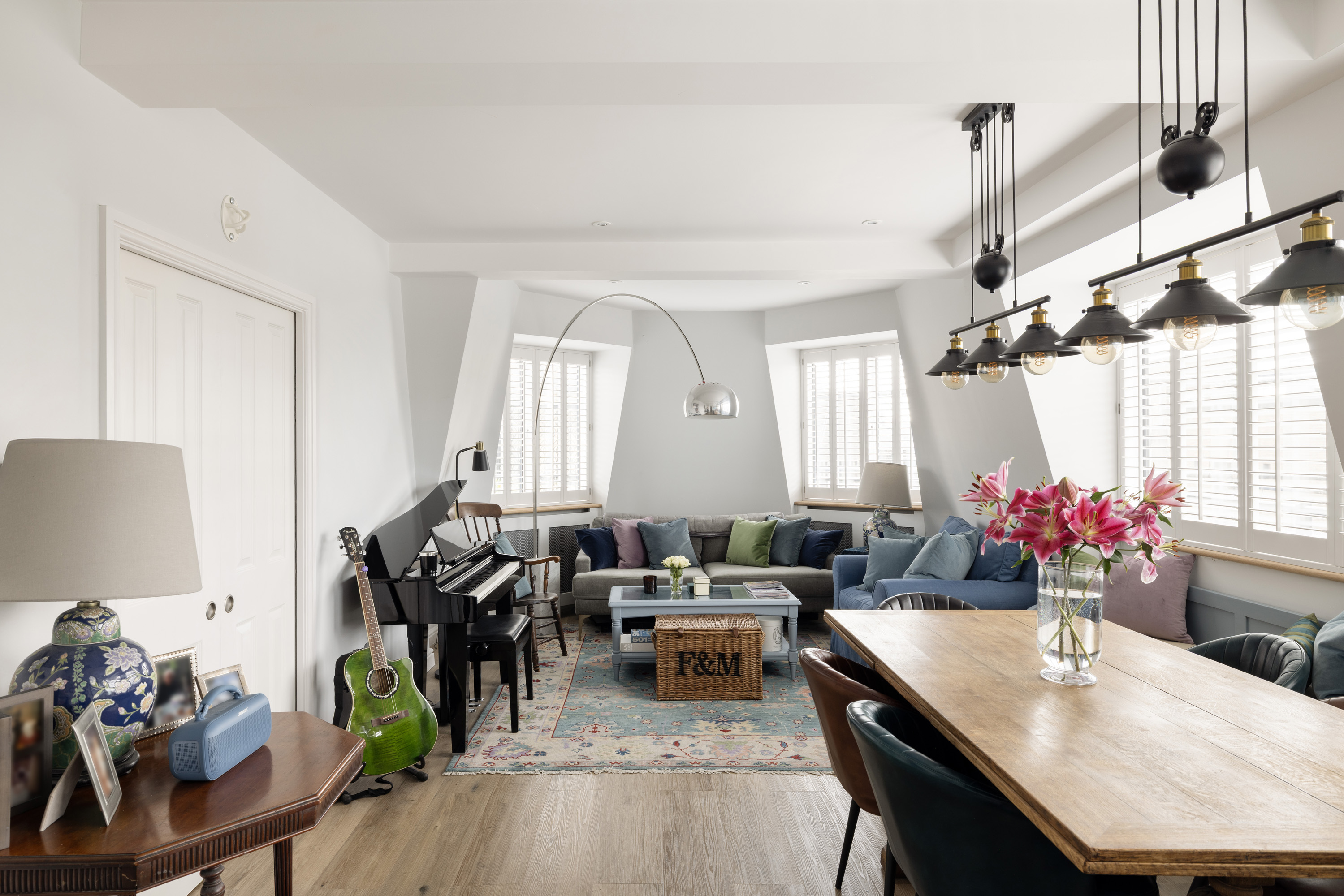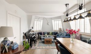 The apartment is centred around a spacious reception room, where a striking curved window floods the space with light throughout the day and offers panoramic views across the surrounding rooftops.
