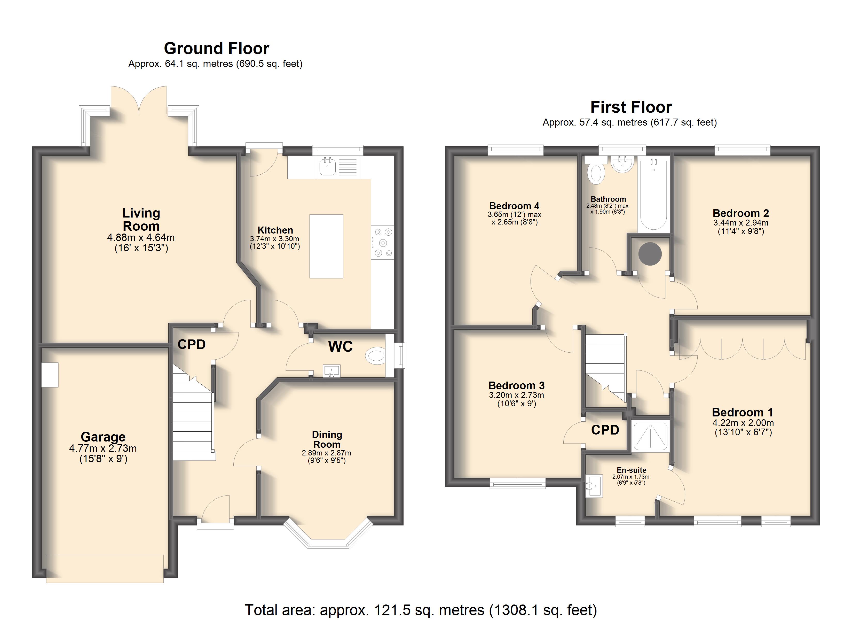 The first floor hosts four well-proportioned bedrooms, including a superb principal bedroom complete with fitted wardrobes and a stylish en-suite shower room. Three additional bedrooms offer flexibility for family, guests, or a home office. A modern family bathroom with a three-piece suite and a ground-floor W/C completes the accommodation.