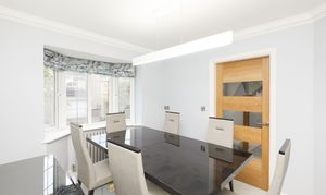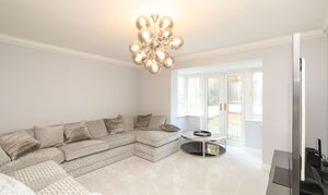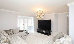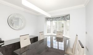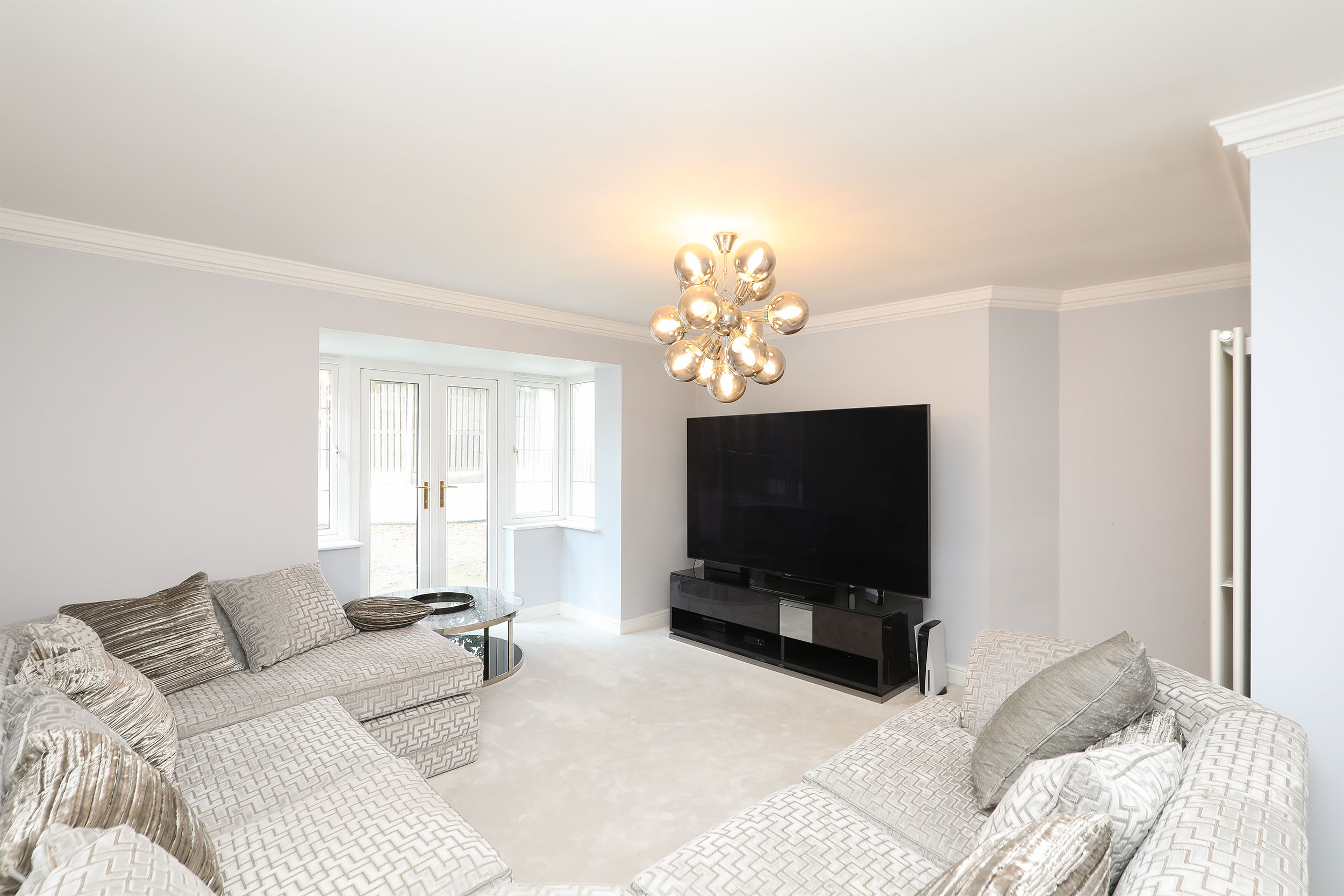 The contemporary kitchen is truly impressive. It is finished with a full range of integrated appliances, quartz worktops, and a striking feature island that creates the perfect space for both everyday living and entertaining. A separate bay-windowed dining room enjoys an abundance of natural light, while the generously sized living room opens directly onto the private rear garden, creating a seamless connection between indoor and outdoor spaces.