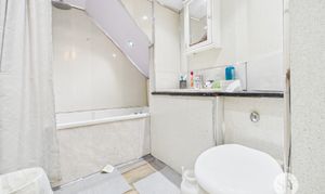Vinyl flooring, three piece in white comprising of wc, basin and shower over bath, towel radiator.
