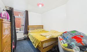 Double bedroom with carpet flooring, double glazed uPVC window, panel radiator.