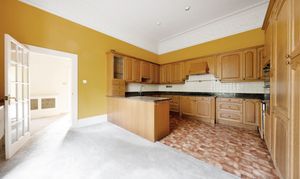 Set at the far end of the terrace, with the entrance to the side of the building, opening into a spacious porch with fitted cupboards and bench seating and this, in turn, leads into the entrance hall with additional storage beneath the stairs and a cloakroom WC. The main reception room showcases the beautiful period features perfectly, with high ceilings having ornate cornicing and picture rails and the original timber shutters fitted to the sash windows and double doors which lead onto the south-facing terrace. The room is generously proportioned and would make an absolutely stunning drawing room. The kitchen is to the front of the building and currently provides plenty of storage with integrated appliances and space for a large dining table and once updated, would offer plenty of space for entertaining. The sun room is another reception room to the rear, opening to the terrace and with views over the lawned communal gardens beyond and adds so much versatility to this property.