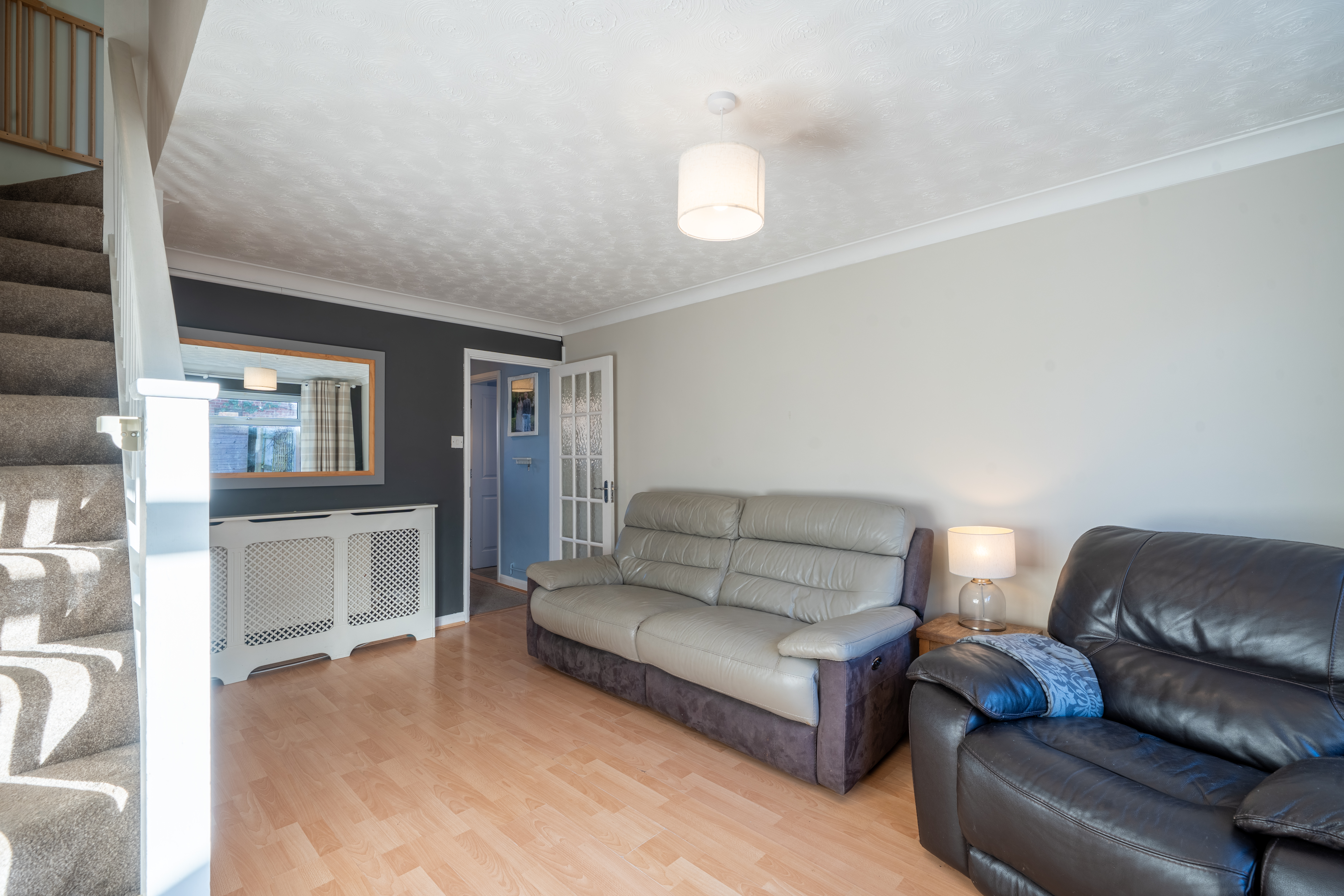 The entrance hall also leads through to the spacious sitting room, which provides ample space for both living and dining furniture. Patio doors open directly onto the rear garden, allowing for plenty of natural light and creating a seamless connection between the indoor and outdoor spaces. Stairs rise from the sitting room to the first-floor accommodation.