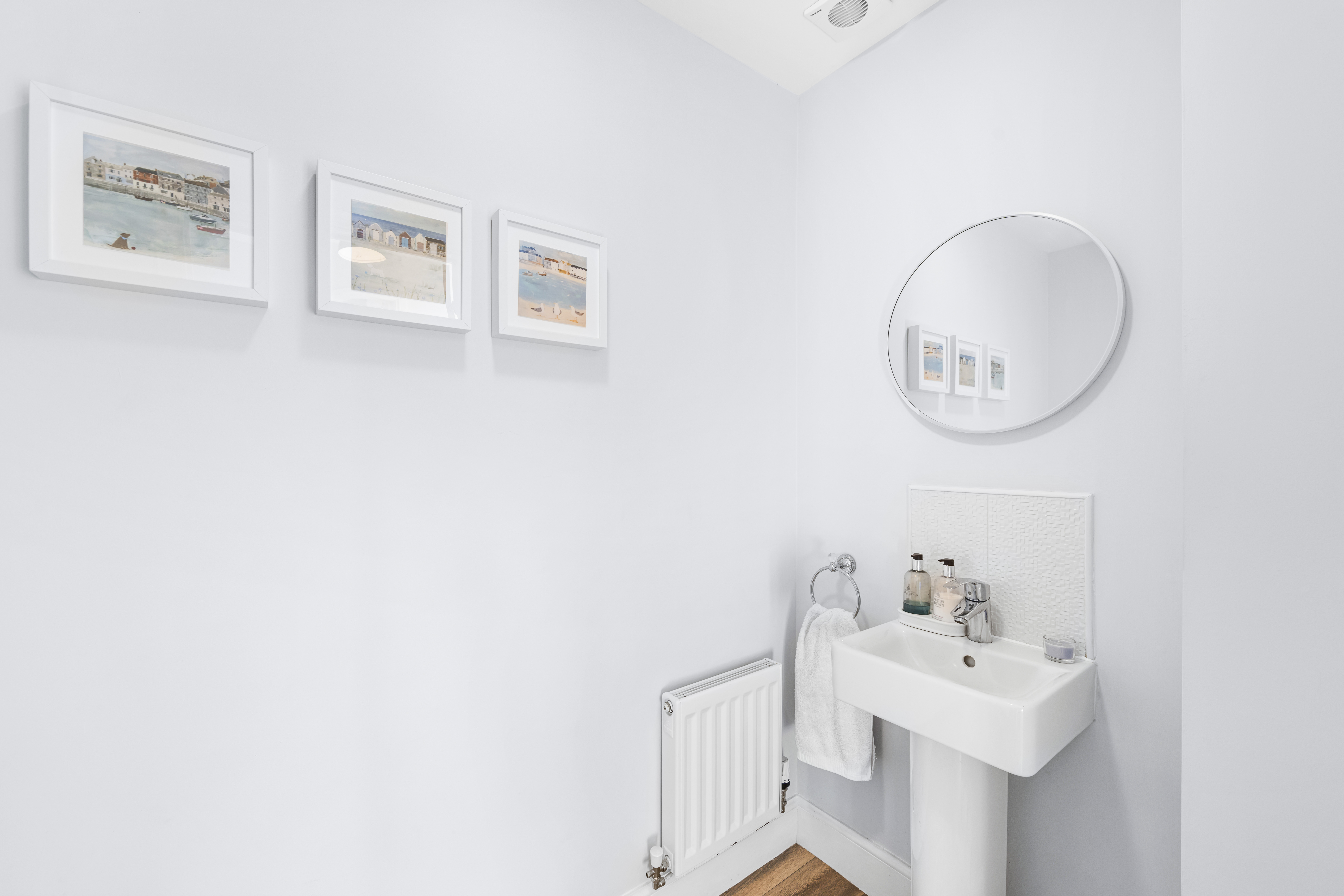 Fitted with dual flush WC and pedestal wash hand basin with mixer tap and tiled splashback. Radiator, extractor.