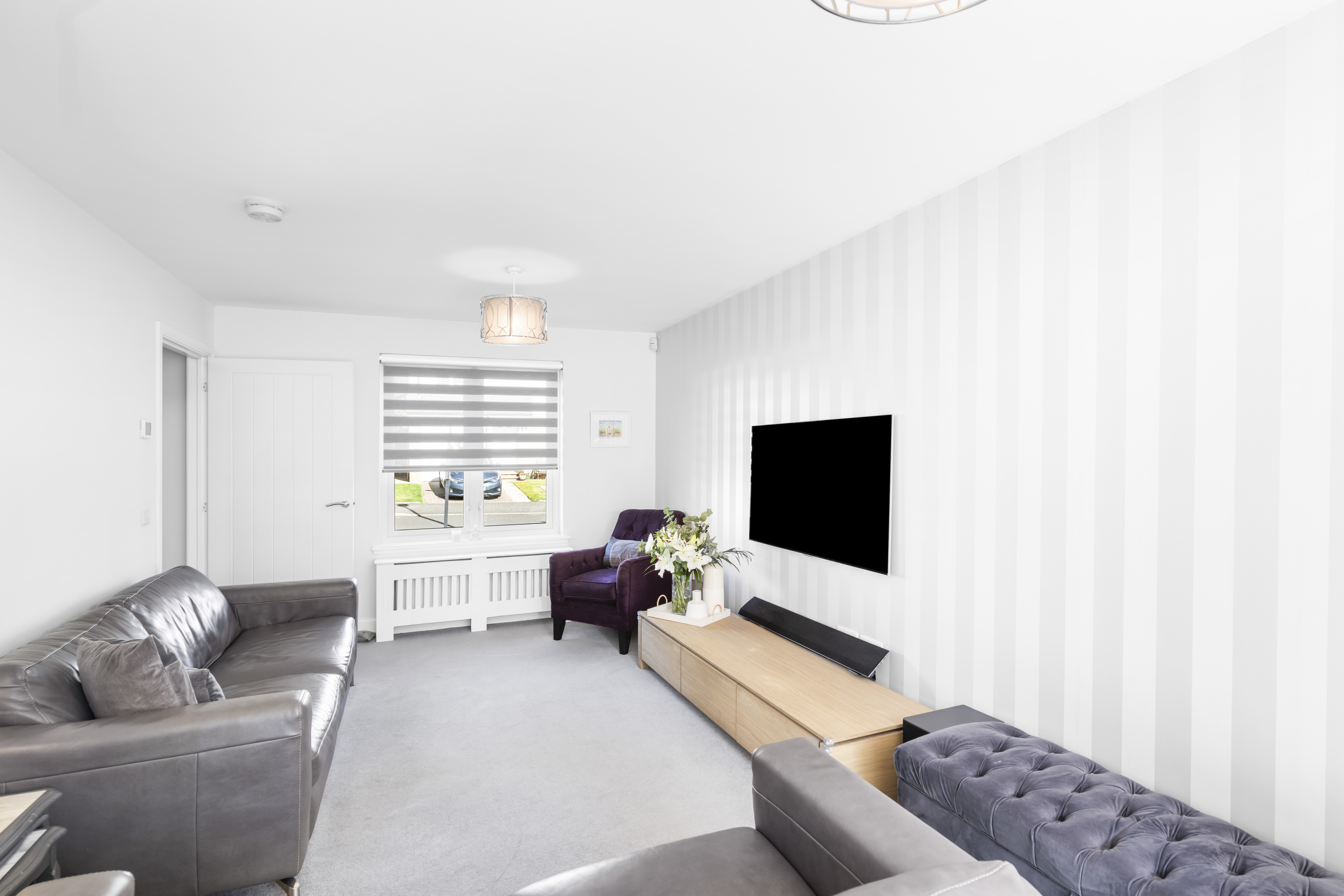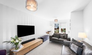Spacious family sitting room with UPVC door with glazed panel to side and front facing window, both with stylish roller blinds. Two radiators with covers.