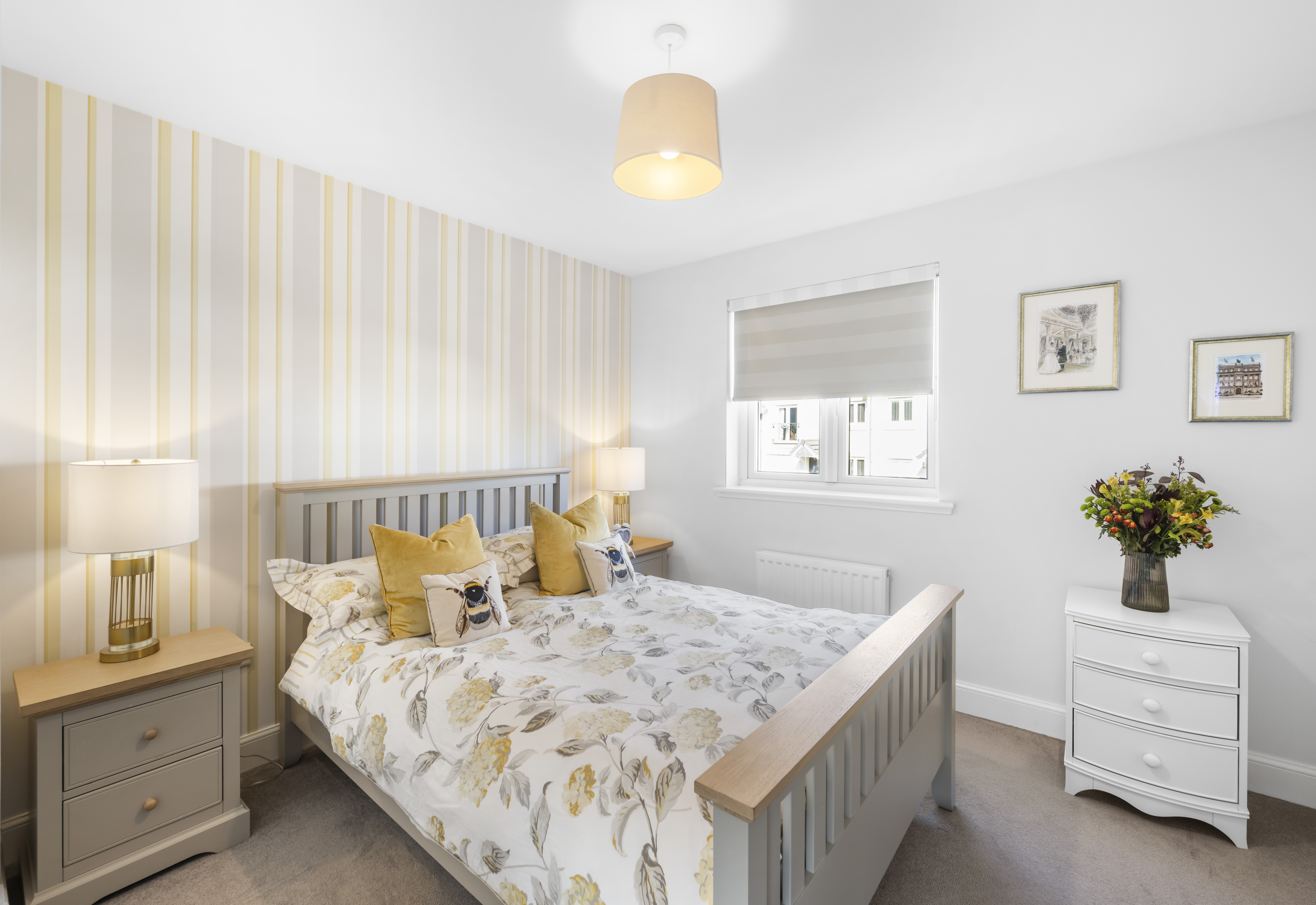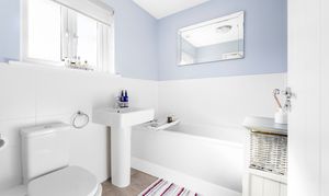 Fitted with dual flush WC, pedestal wash basin and bath with mixer tap. Tiled to dado height around fitments. Opaque glazed window with roller blind. Vinyl floorcovering, radiator.