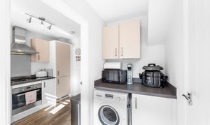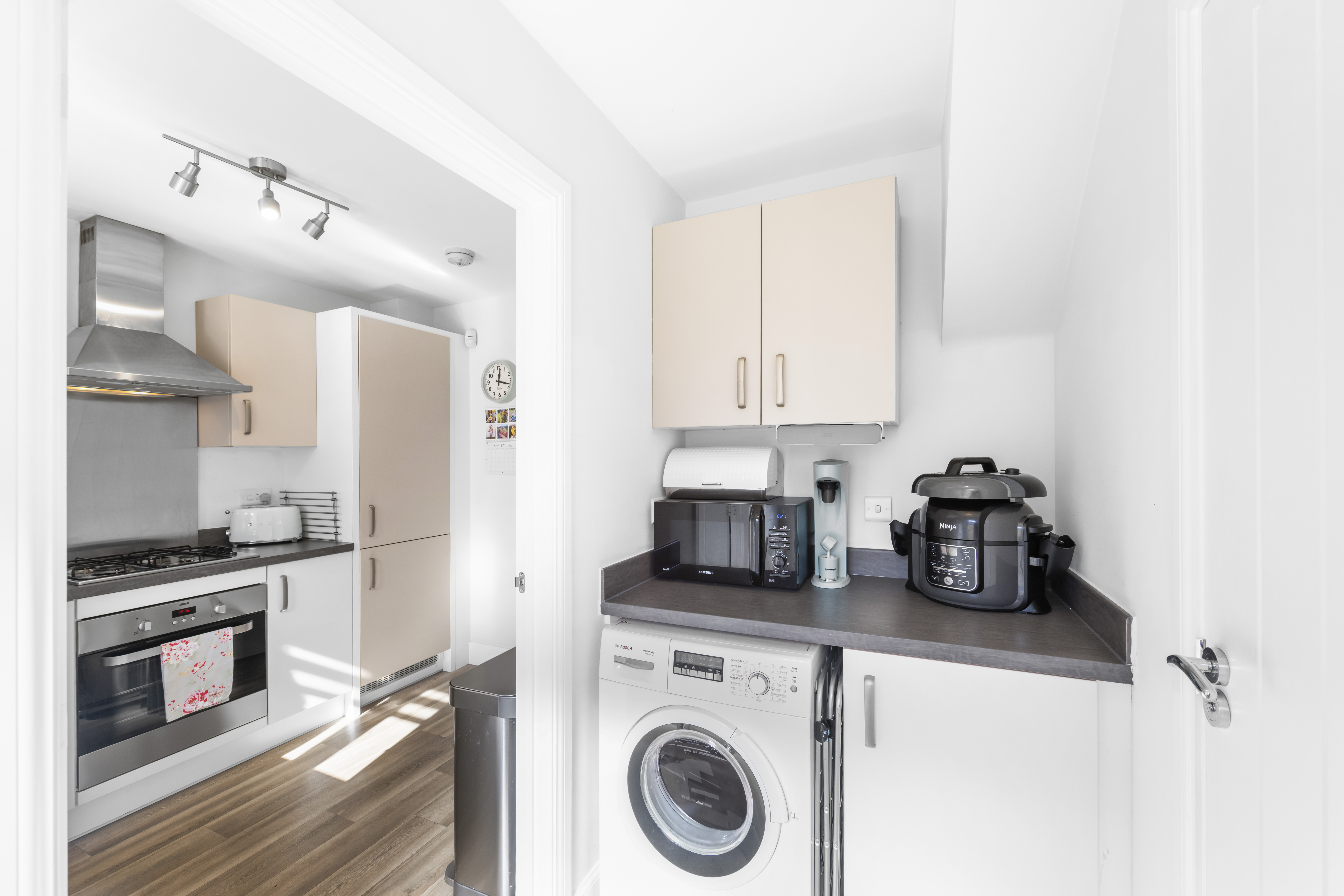 Fitted with base and wall mounted units, worktop and matching splashback. The washing machine is included in the sale but is not warranted. Doors to kitchen and WC and part opaque glazed door to rear garden. Radiator.