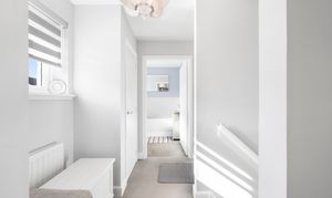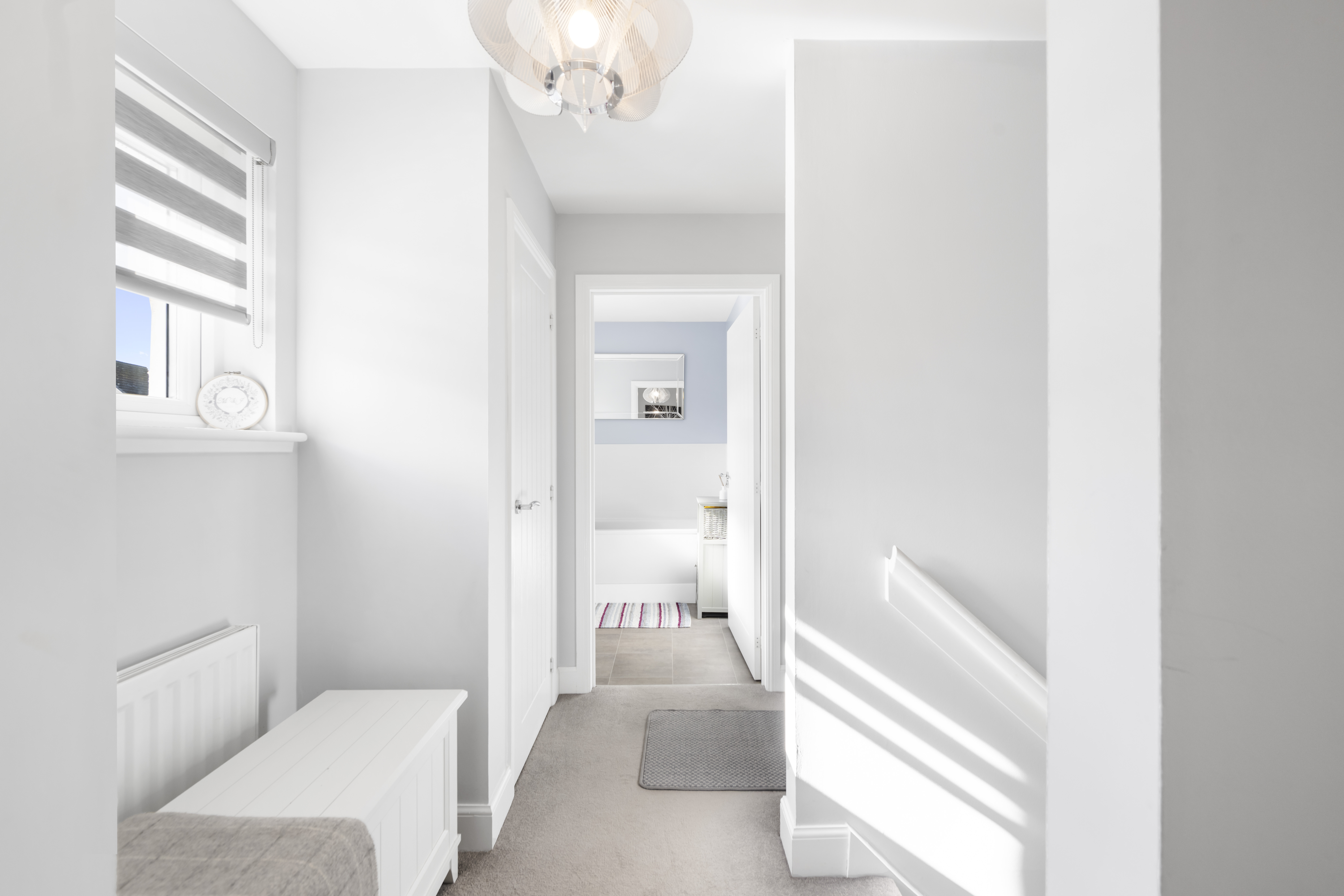 Doors to bedrooms, bathroom and two cupboards, one shelved and one with hanging rail and shoe racks. Rear facing window with roller blind. Hatch to floored loft.