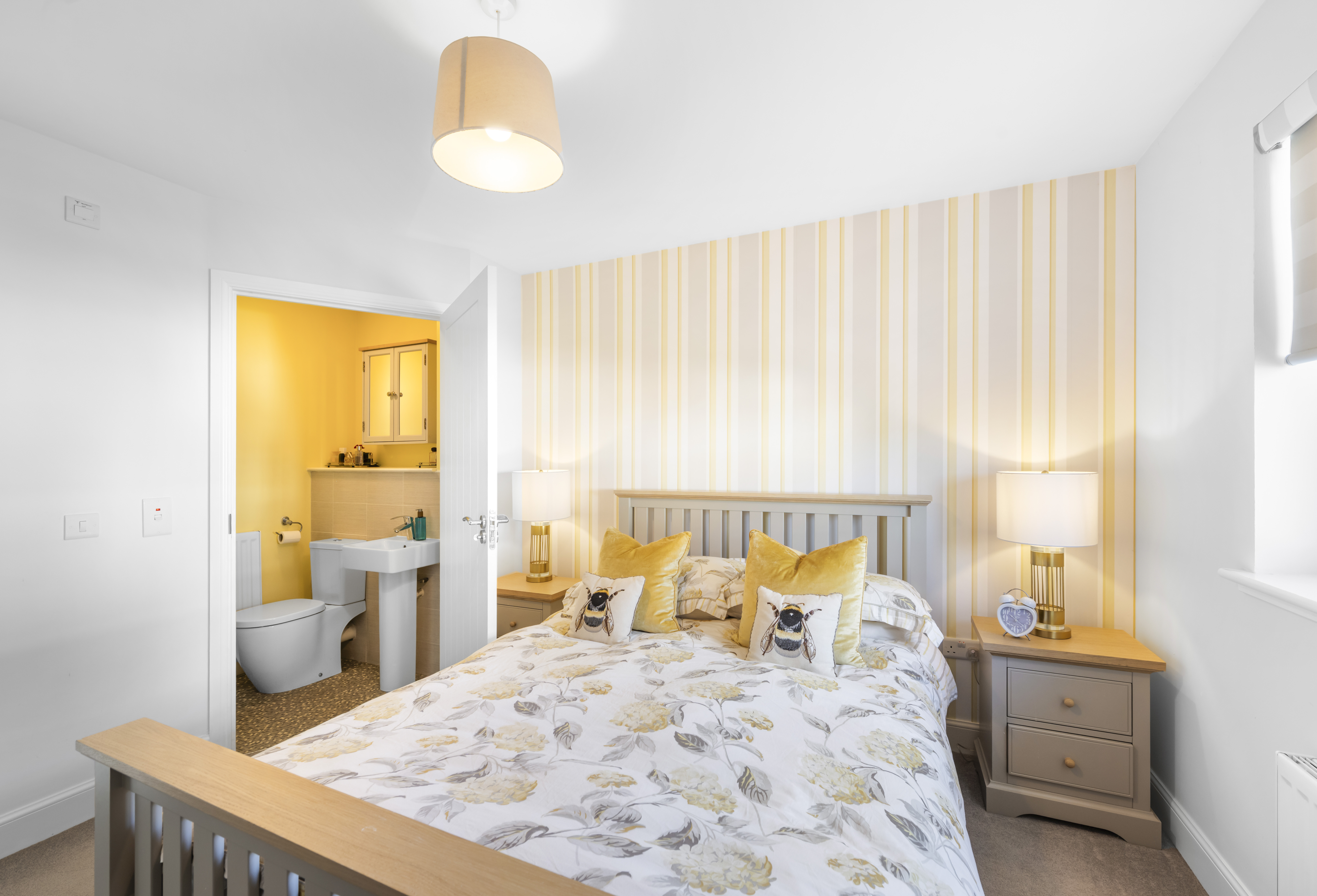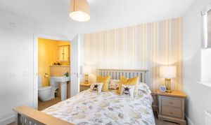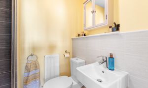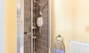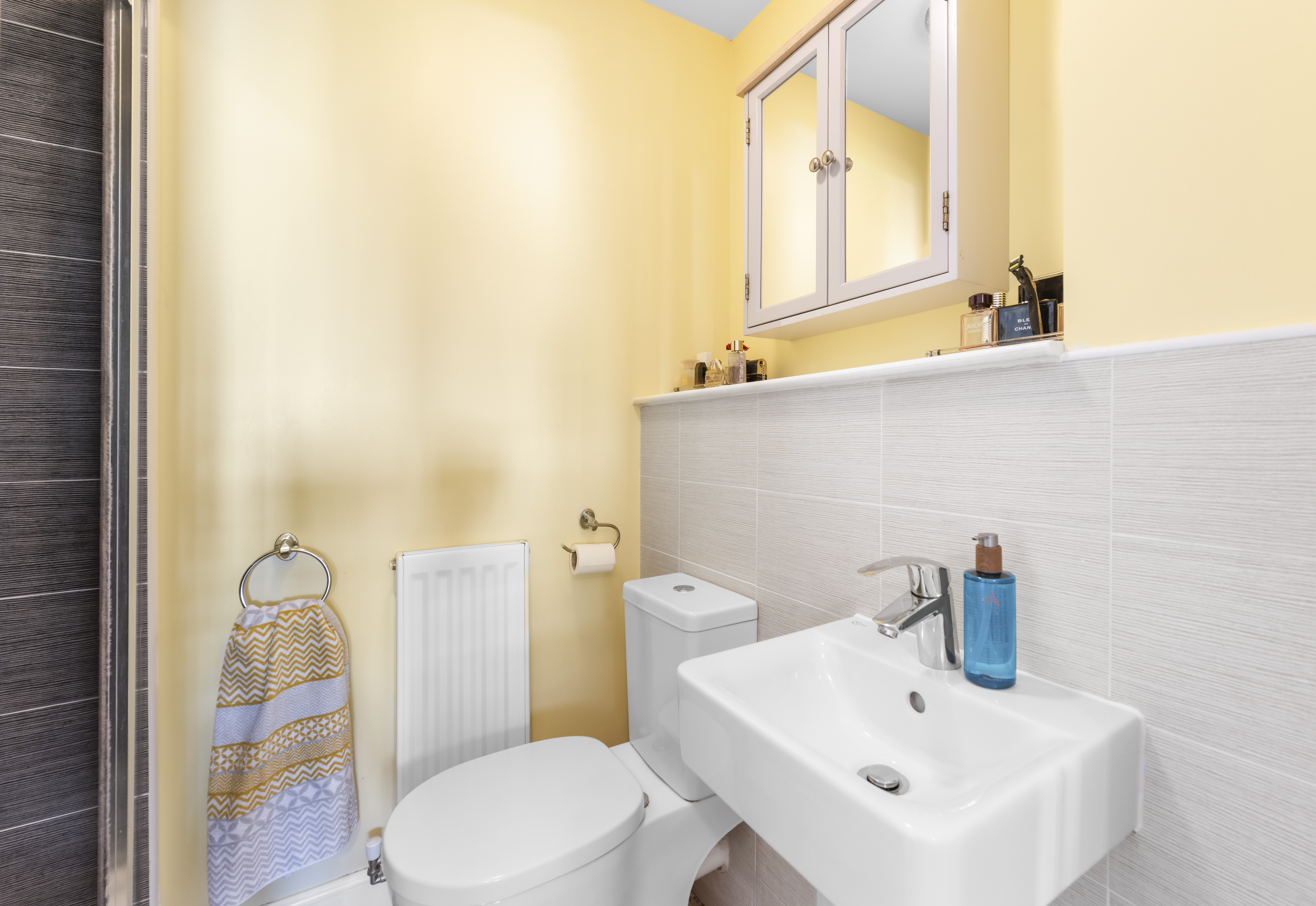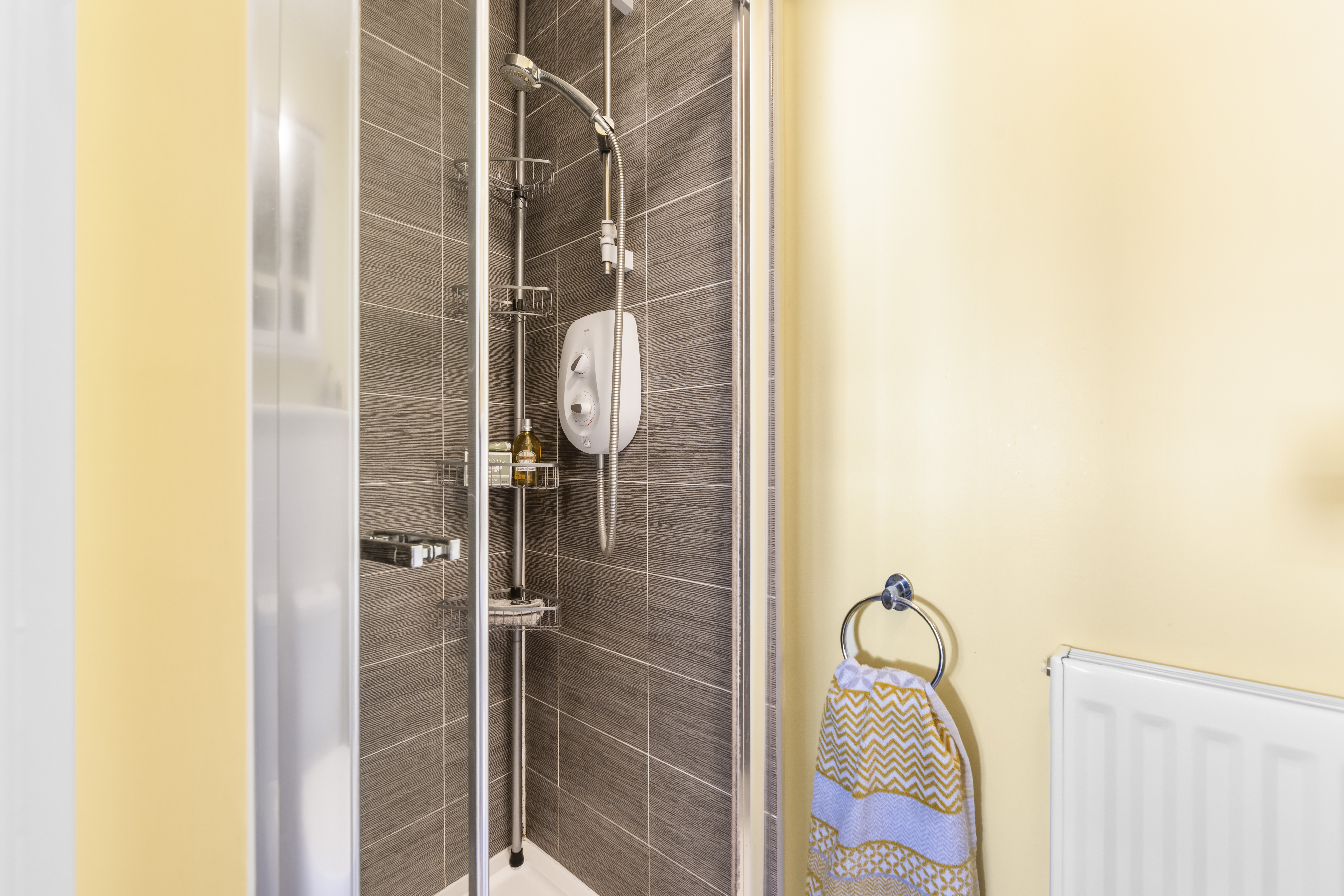 Fitted with dual flush WC, pedestal wash basin and fully tiled shower cubicle. Tiled to dado height around fitments. Vinyl floorcovering, radiator.